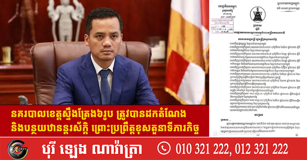 នគរបាលខេត្តស្ទឹងត្រែង៦រូប ត្រូវបានដកតំណែង និងបន្ថយឋានន្តរស័ក្តិ ព្រោះប្រព្រឹត្តខុសតួនាទីភារកិច្ច