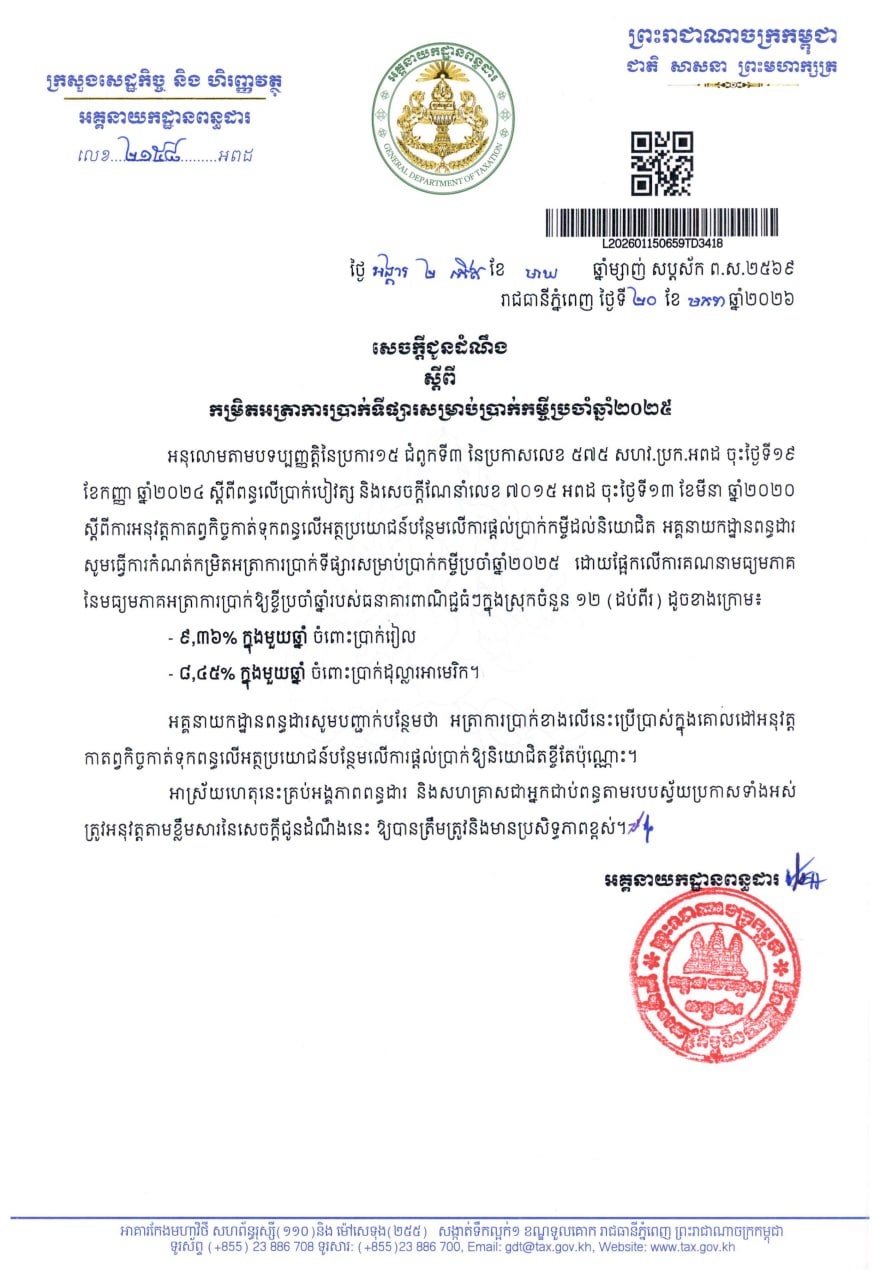 អគ្គនាយកដ្ឋានពន្ធដារ ជូនដំណឹងពីកម្រិតអត្រាការប្រាក់ទីផ្សារ សម្រាប់ប្រាក់កម្ចីប្រចាំឆ្នាំ២០២៥ (Video inside)