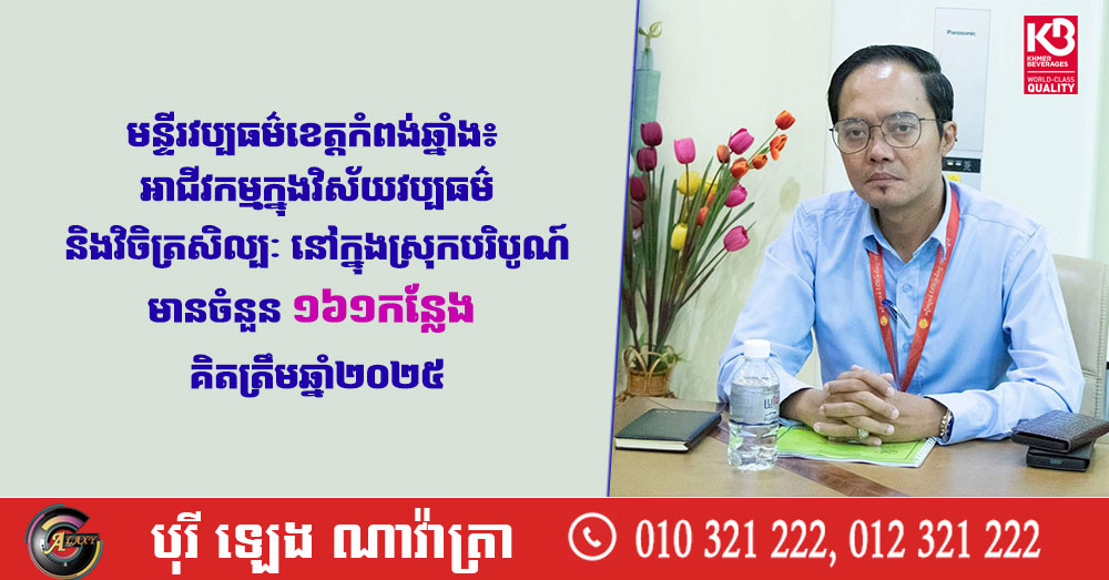 (កំពង់ឆ្នាំង)៖ អាជីវកម្មក្នុងវិស័យវប្បធម៌ និងវិចិត្រសិល្បៈ នៅក្នុងស្រុកបរិបូណ៍ ខេត្តកំពង់ឆ្នាំង មានចំនួនសរុប ១៦១កន្លែង គិតត្រឹមឆ្នាំ២០២៥។ នេះបើតាមការបញ្ជាក់របស់លោក ប៊ុនថន សុខាណារិទ្ធ ប្រធានមន្ទីរវប្បធម៌និងវិចិត្រសិល្បៈខេត្តកំពង់ឆ្នាំង។