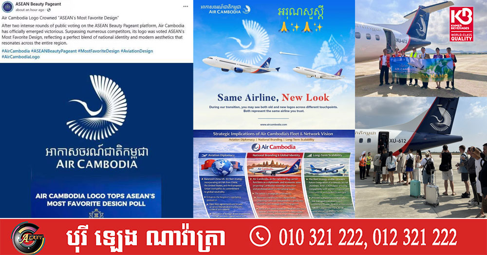 (ភ្នំពេញ)៖ ស្លាកសញ្ញាថ្មី (Logo) របស់ក្រុមហ៊ុនអាកាសចរណ៍ Air Cambodia ដែលបានរចនាថ្មី និងដាក់ប្រើប្រាស់កាលពីពេលថ្មីៗនេះ ត្រូវបានជ្រើសរើសជាស្លាកសញ្ញា ដែលមាន «ការរចនាដែលពេញនិយមបំផុតរបស់អាស៊ាន» និងកំពុងទទួលបានការចាប់អារម្មណ៍ពីភ្ញៀវទេសចរជាតិ និងអន្តរជាតិ។