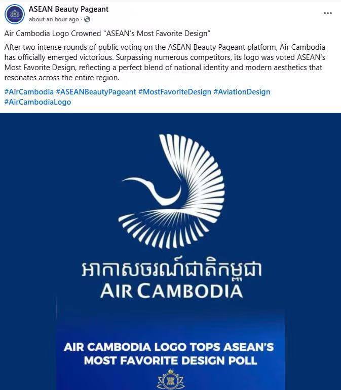 យោងតាមការទំព័រហ្វេសប៊ុក ASEAN Beauty Pageant បានបញ្ជាក់ថា បន្ទាប់ពីការបោះឆ្នោតជាសាធារណៈយ៉ាងស្វិតស្វាញ ចំនួនពីរជុំនៅលើវេទិកាប្រកួតសម្រស់អាស៊ាន ក្រុមហ៊ុនអាកាសចរណ៍ Air Cambodia បានទទួលជ័យជម្នះ ដោយត្រូវបានជ្រើសរើសជាផ្លូវការ ថាជាស្លាកសញ្ញាដែលមាន «ការរចនាពេញនិយមបំផុតរបស់អាស៊ាន» ដែលបានវ៉ាដាច់ឡូហ្គោក្រុមហ៊ុនដៃគូប្រកួតប្រជែងជាច្រើន។