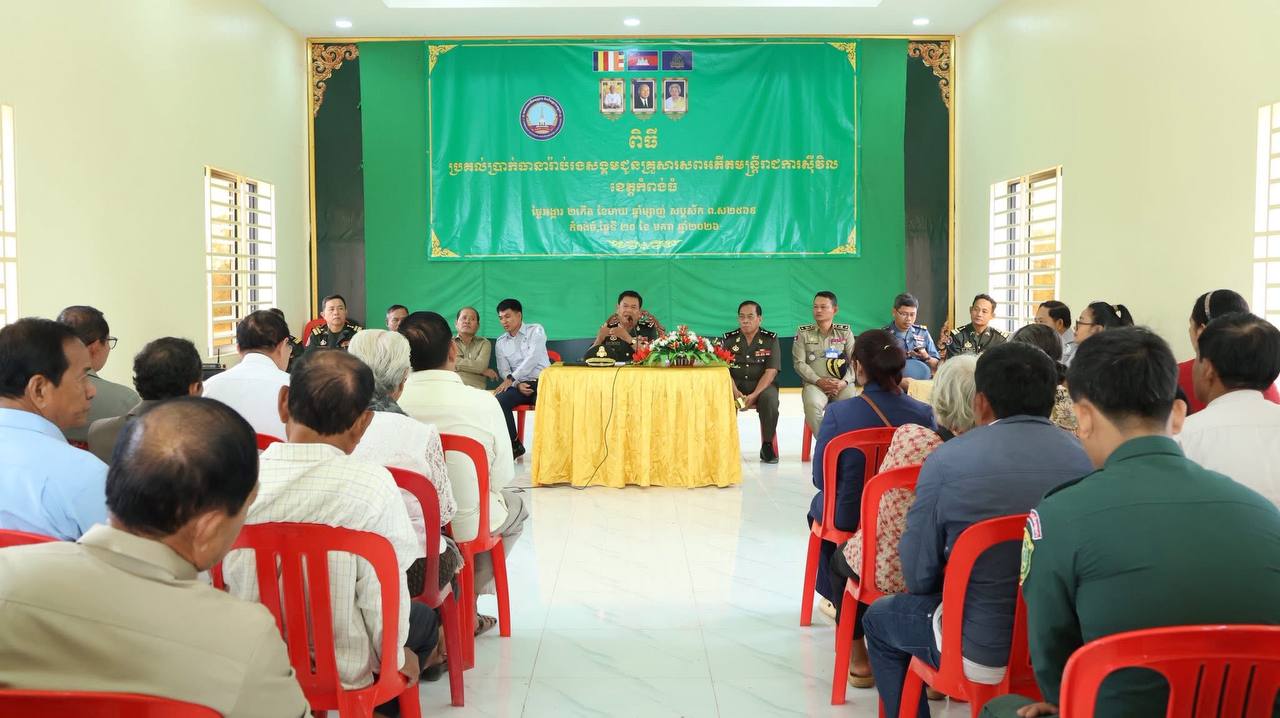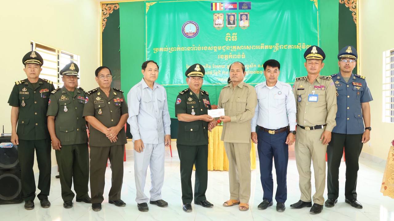 (កំពង់ធំ)៖ លោកឧត្តមសេនីយ៍ទោ សោម ស៊ុន មេបញ្ជាការតំបន់ប្រតិបត្តិការសឹករង តំណាងលោក នួន ផារ័ត្ន អភិបាលខេត្ត និងជាប្រធានគណៈកម្មាធិការសមាគមអតីតយុទ្ធជន និងនិវត្តជនកម្ពុជាខេត្តកំពង់ធំ នាថ្ងៃទី២០ ខែ មករា ឆ្នាំ២០២៦នេះ បានអញ្ជើញប្រគល់ថវិកាធានារ៉ាប់រងសង្គមចំនួន ១២០,៦៧៣,៥០០រៀល របស់រាជរដ្ឋាភិបាល ជូនគ្រួសារសពអតីតមន្ត្រីរាជការស៊ីវិលចំនួន១៣គ្រួសារ ដែលអញ្ជើញមកពីតាមបណ្ដា មូលដ្ឋាននានាក្នុងខេត្តកំពង់ធំ។