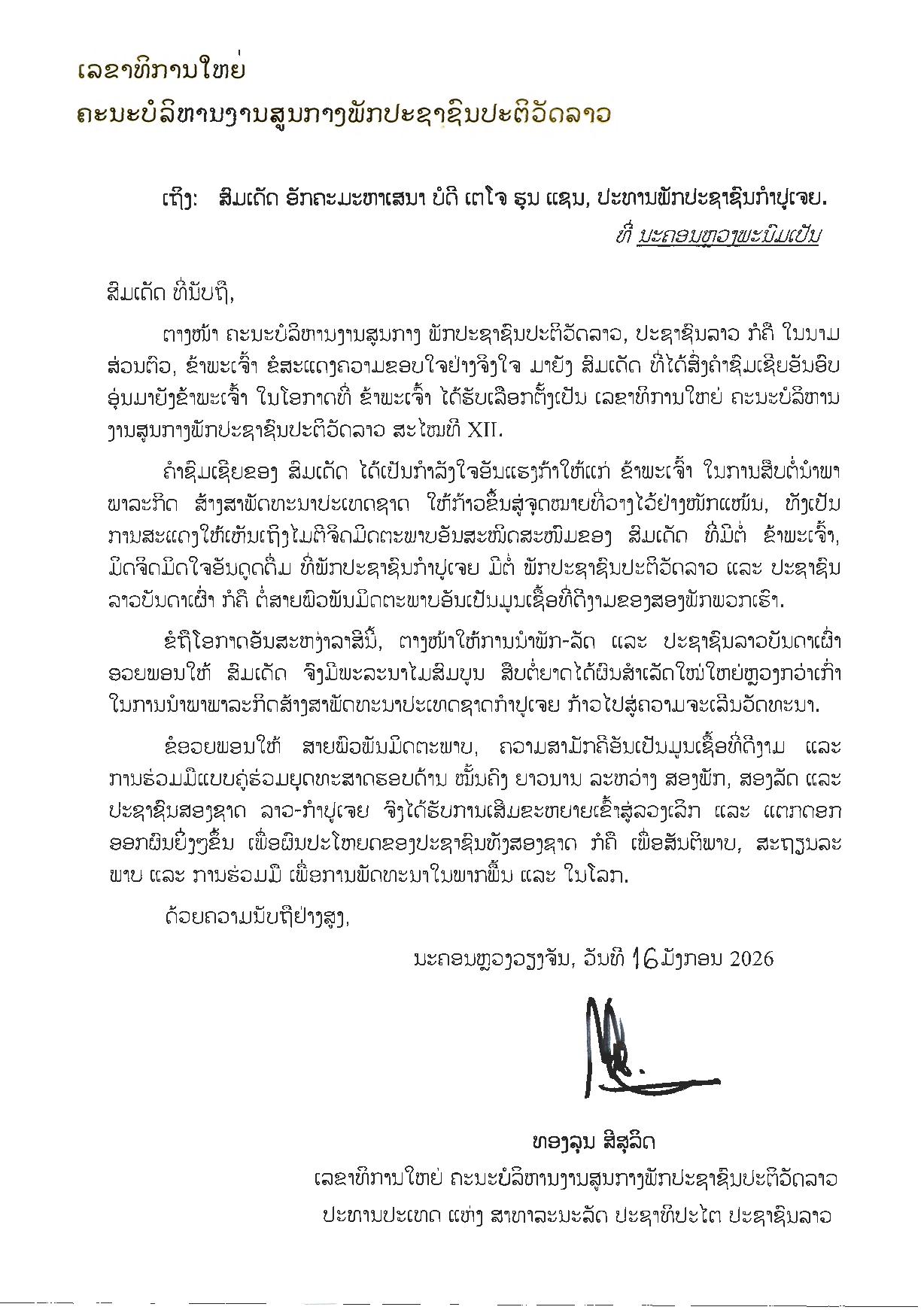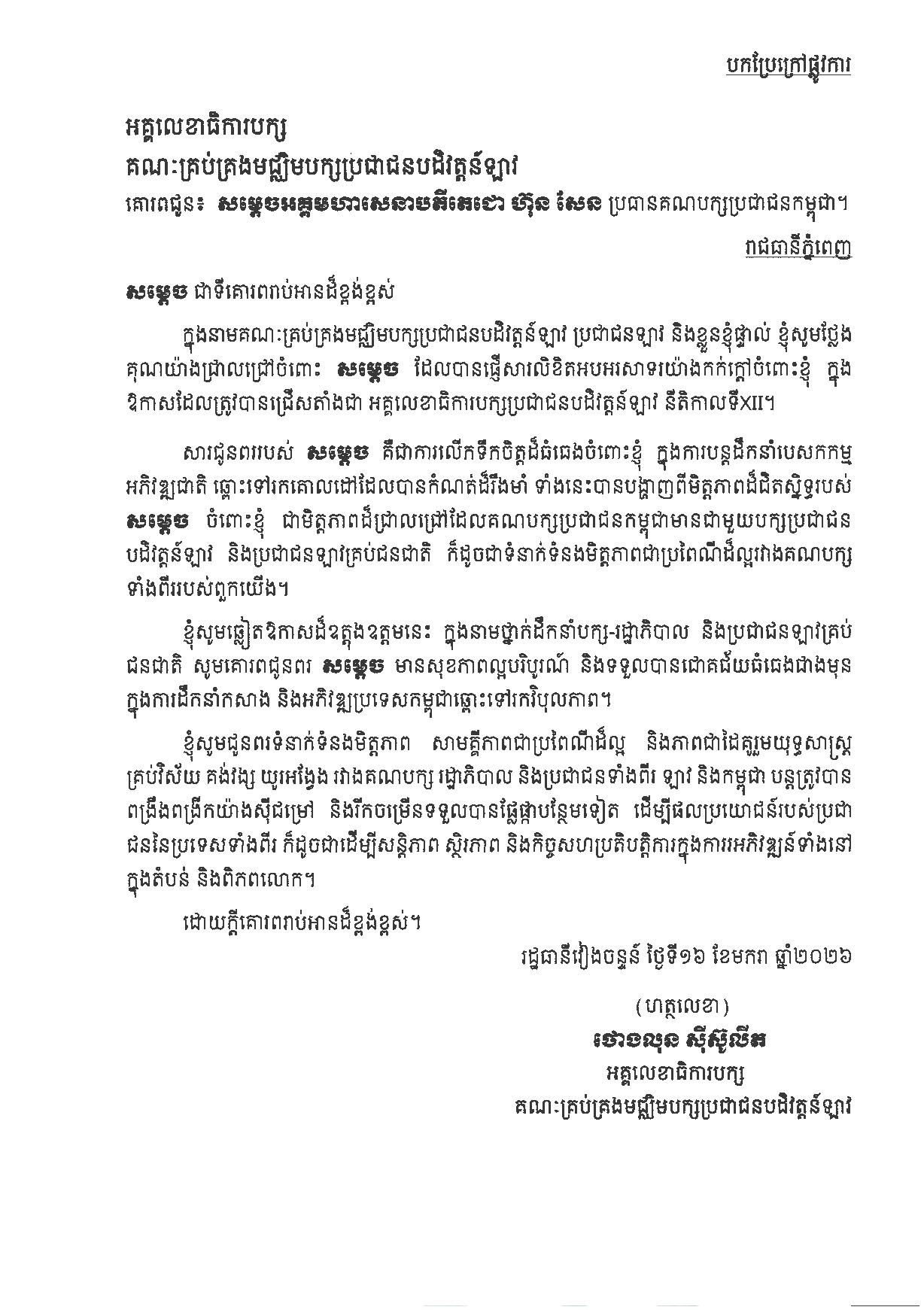 ក្នុងនាមគណៈគ្រប់គ្រងមជ្ឈិមបក្សប្រជាជនបដិវត្តន៍ឡាវ ប្រជាជនឡាវ និងខ្លួនខ្ញុំផ្ទាល់ ខ្ញុំសូមថ្លែង គុណយ៉ាងជ្រាលជ្រៅចំពោះ សម្តេច ដែលបានផ្ញើសារលិខិតអបអរសាទរយ៉ាងកក់ក្តៅចំពោះខ្ញុំ ក្នុង ឱកាសដែលត្រូវបានជ្រើសតាំងជា អគ្គលេខាធិការបក្សប្រជាជនបដិវត្តន៍ឡាវ នីតិកាលទីXII។