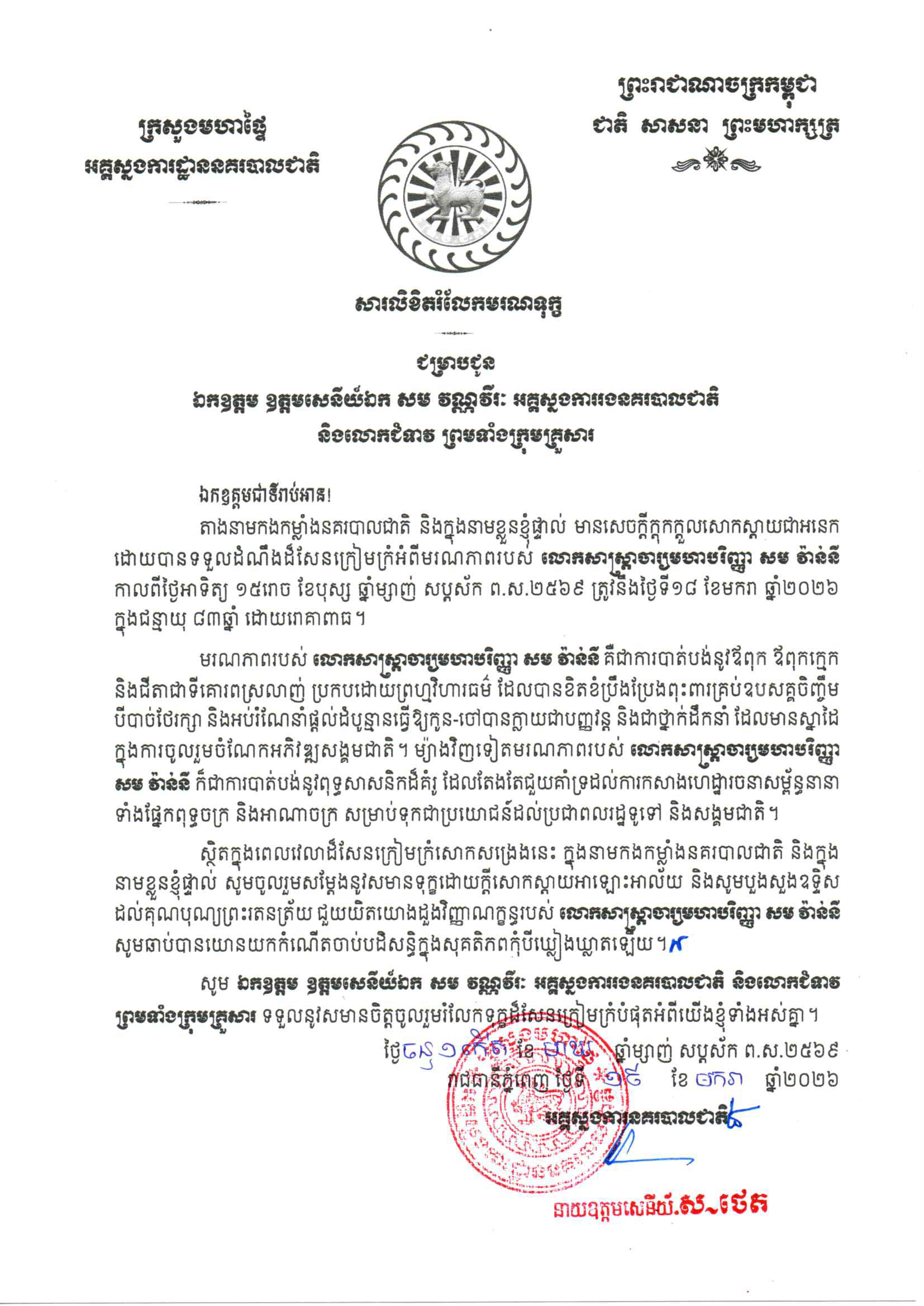 (ភ្នំពេញ)៖ នាយឧត្តមសេនីយ៍ ស ថេត អគ្គស្នងការនគរបាលជាតិ បានផ្ញើសារចូលរួមរំលែកទុក្ខចំពោះមរណភាព លោកសាស្ដ្រាចារ្យមហាបរិញ្ញា សម វ៉ាន់នី ឪពុកបង្កើតឧត្តមសេនីយ៍ឯក សម វណ្ណវីរៈ អគ្គស្នងការរងនគរបាលជាតិ ដែលបានទទួលមរណភាពកាលពីថ្ងៃអាទិត្យ ១៥រោច ខែបុស្ស ឆ្នាំម្សាញ់ សប្ដស័ក ព.ស.២៥៦៩ ត្រូវនឹងថ្ងៃទី១៨ ខែមករា ឆ្នាំ២០២៦ ក្នុងជន្មាយុ៨៣ឆ្នាំ ដោយរោគាពាធ។