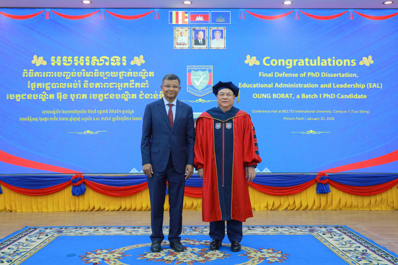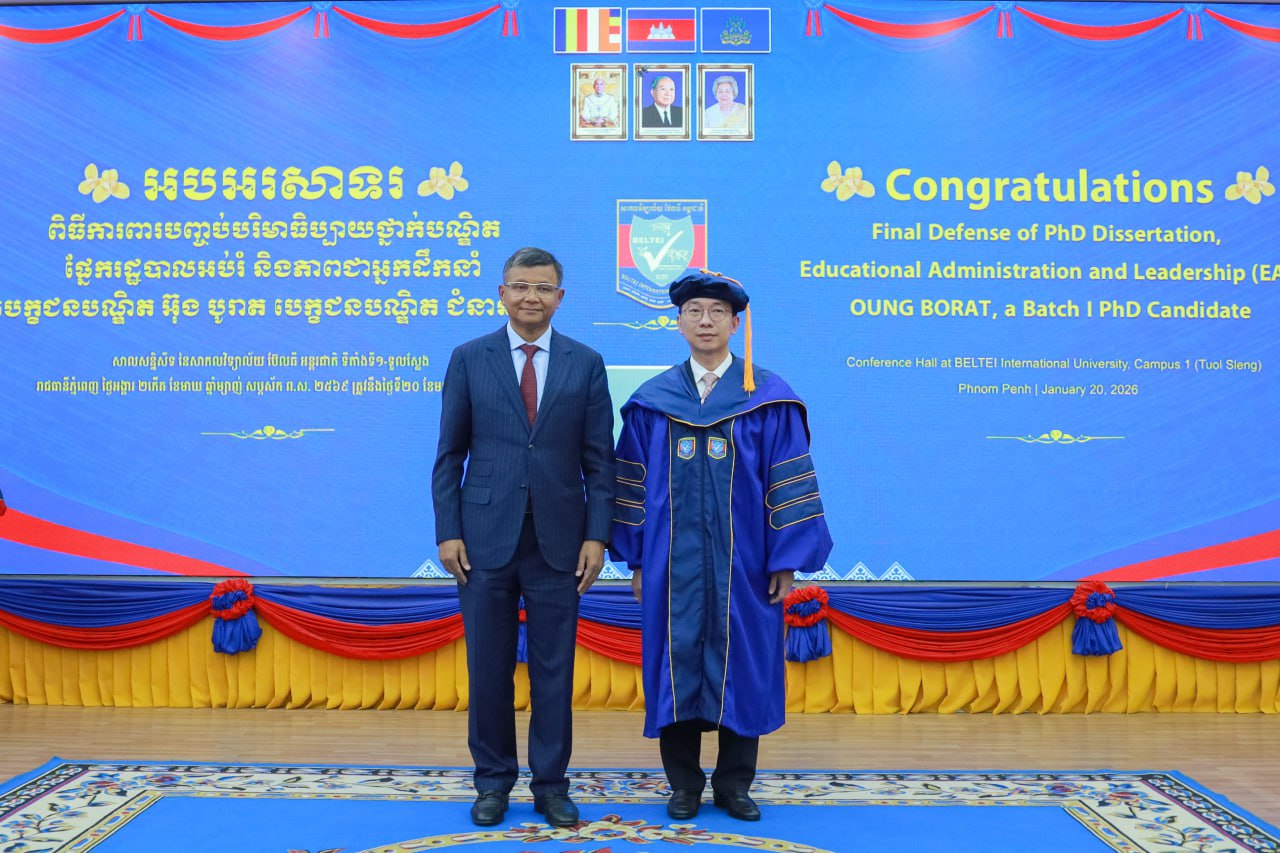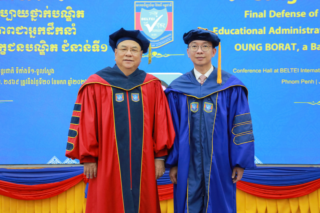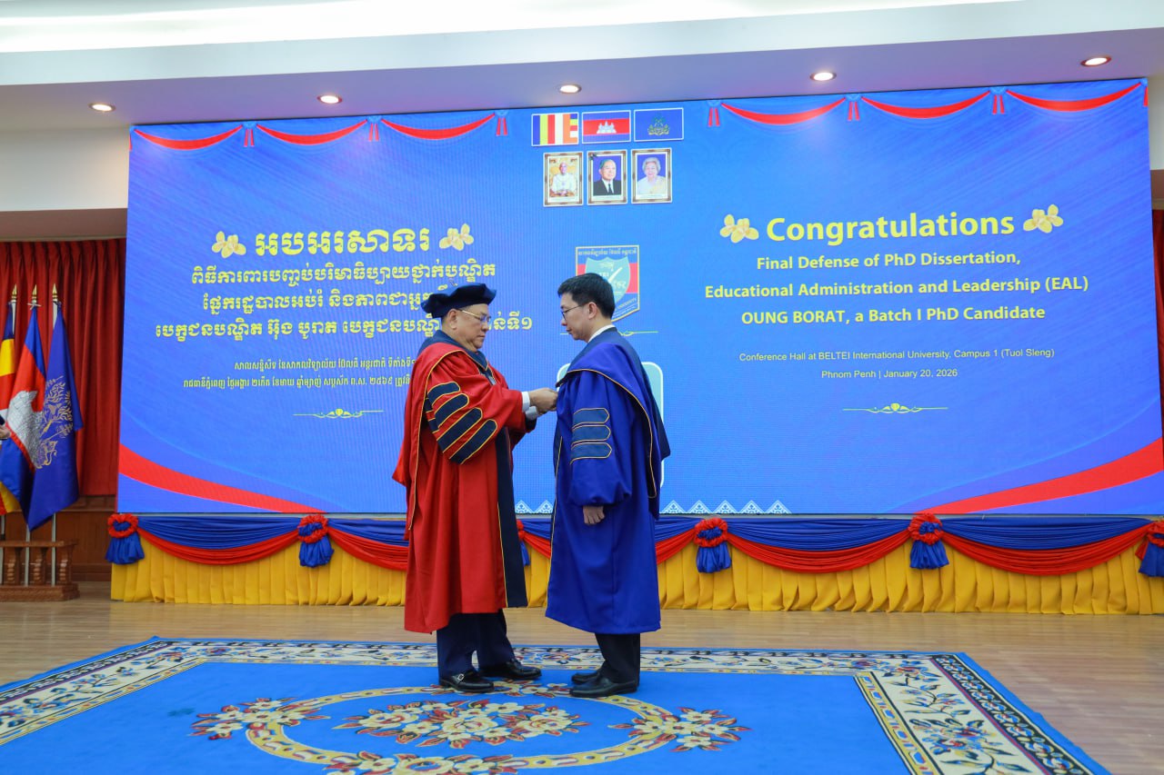 (ភ្នំពេញ)៖ សាកលវិទ្យាល័យ ប៊ែលធី អន្តរជាតិ បានរៀបចំកម្មវិធី «ការពារបញ្ចប់ បរិមាធិប្បាយ ថ្នាក់បណ្ឌិត (Final Defense of PhD Dissertation)» ជំនាញរដ្ឋបាលអប់រំ និងភាពជាអ្នកដឹកនាំ ក្រោមអធិបតីភាពលោកបណ្ឌិតសភាចារ្យ ហង់ជួន ណារ៉ុន ឧបនាយករដ្ឋមន្ត្រី រដ្ឋមន្ត្រីក្រសួងអប់រំ យុវជន និងកីឡា។