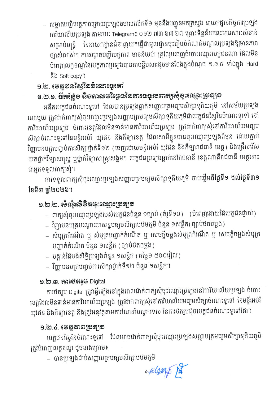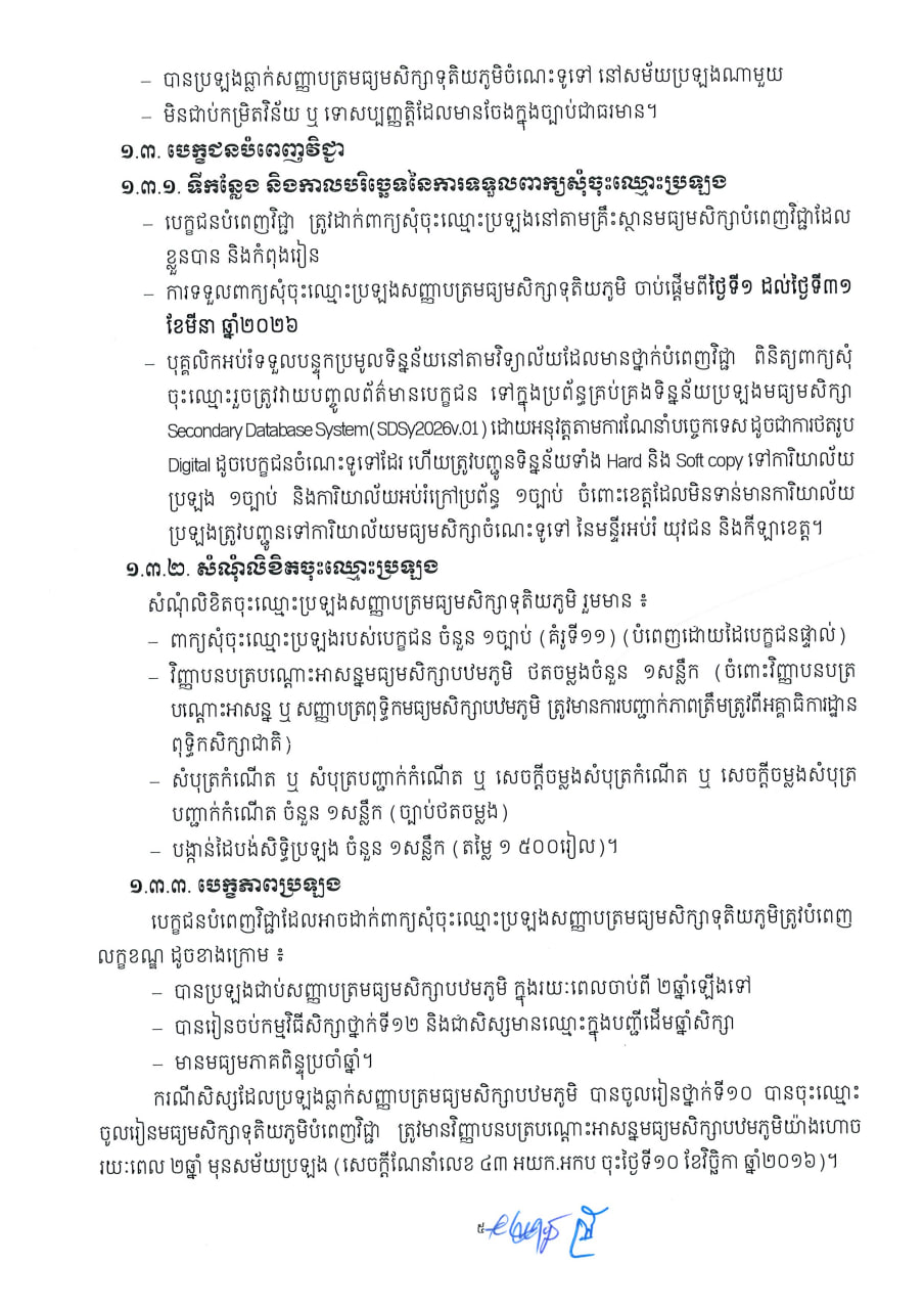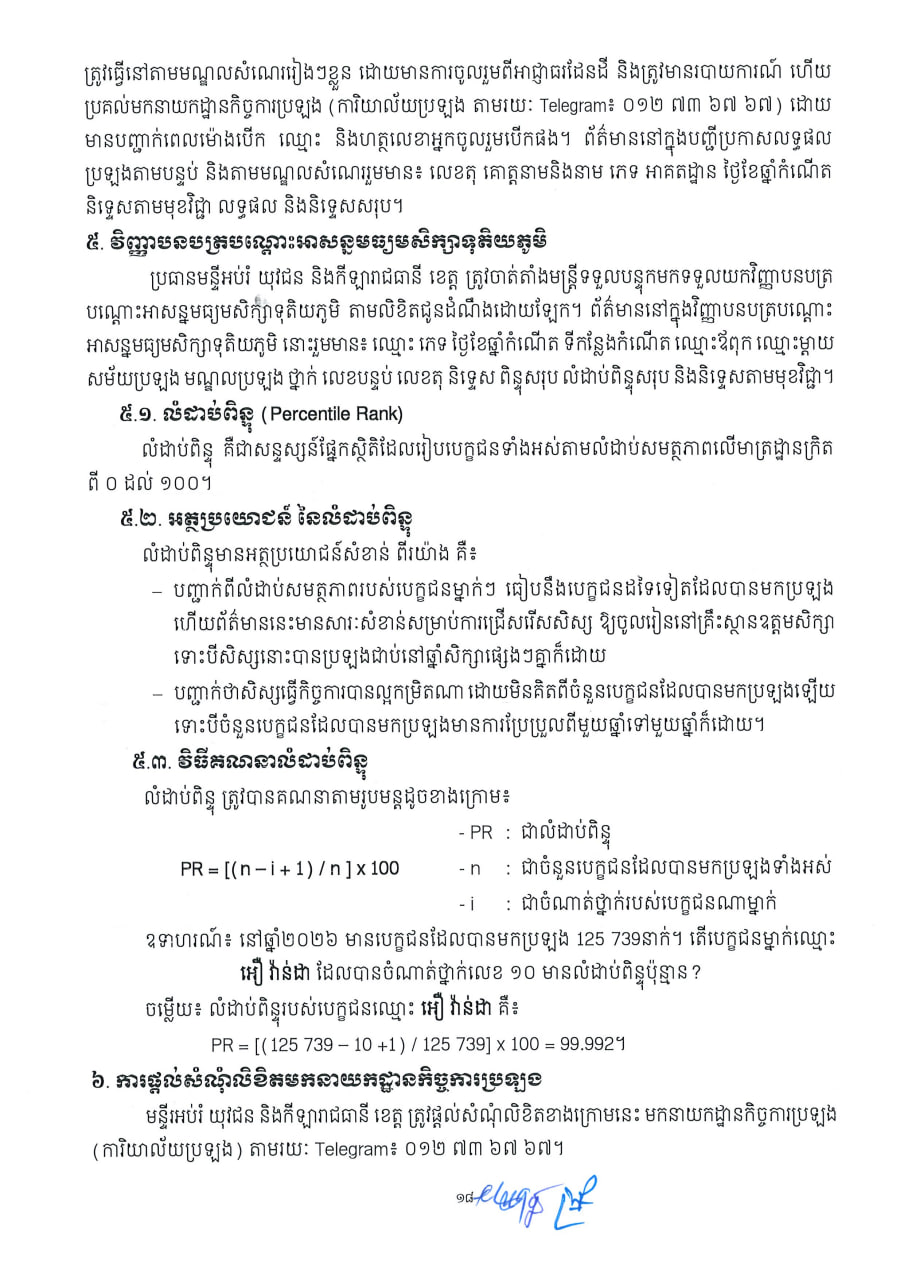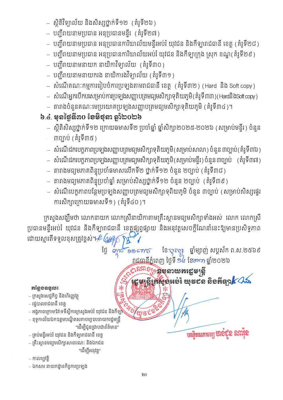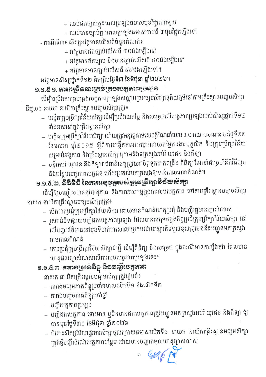 (ភ្នំពេញ)៖ ដើម្បីធានាគោលការណ៍ច្បាប់ យុត្តិធម៌ តម្លាភាព និងលទ្ធផលទទួលយកបានក្នុងការប្រឡងសញ្ញាបត្រ មធ្យមសិក្សាទុតិយភូមិ ក្រសួងអប់រំ យុវជន និងកីឡា បានចេញសេចក្តីណែនាំស្តីពីការអនុវត្តប្រកាសលេខ ១៥៥ អយក.ប្រក ចុះថ្ងៃទី២៩ ខែមករា ឆ្នាំ២០១៩ ស្តីពីការរៀបចំ និងការប្រព្រឹត្តទៅនៃការប្រឡងសញ្ញាបត្រមធ្យមសិក្សាទុតិយភូមិ សម្រាប់ ឆ្នាំសិក្សា ២០២៥-២០២៦៕
