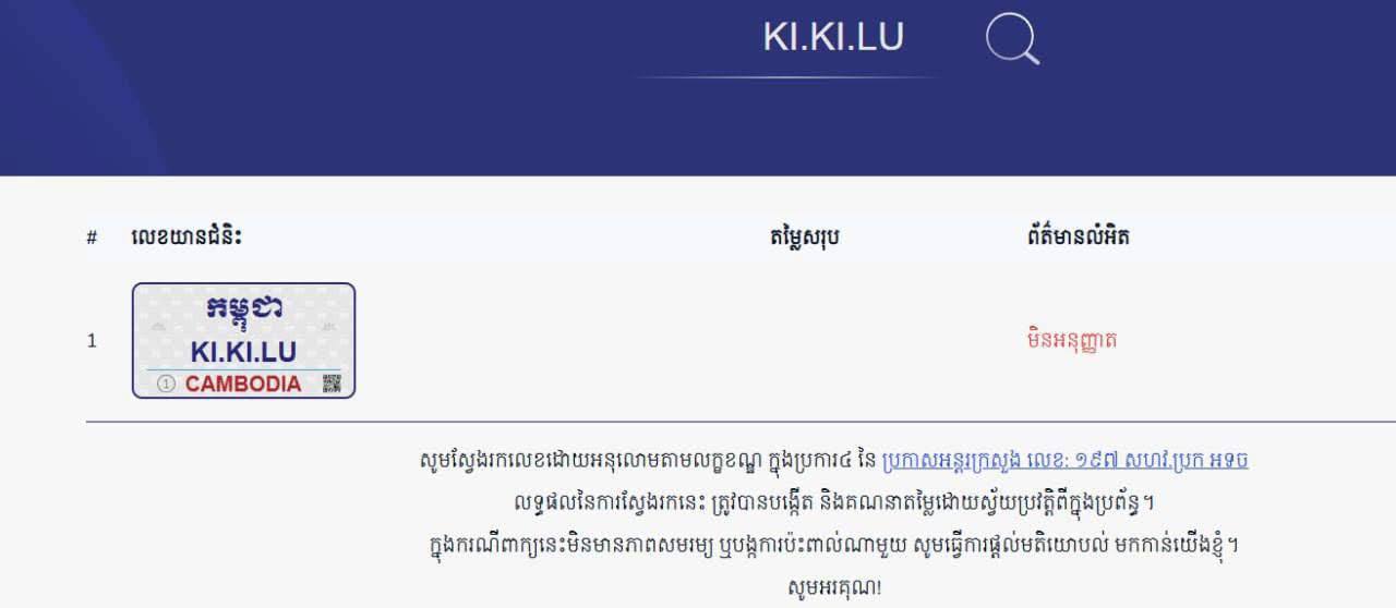 (ភ្នំពេញ)៖ ក្រោយមានការផ្ទុះវែកញ៉ែកលើបណ្តាញសង្គមទៅលើផ្លាកលេខកម្ពុជា «KI.KI.LO» ដែលបានបំពាក់លើម៉ូតូ នឹងត្រូវបានម្ចាស់ម៉ូតូជិះនៅតាមដងផ្លូវ, លោក ផន រឹម អ្នកនាំពាក្យក្រសួងសាធារណការ និងដឹកជញ្ជូន បានបញ្ជាក់ឱ្យដឹងថា ផ្លាកលេខកម្ពុជា «KI.KI.LO» ជាផ្លាកលេខក្លែងក្លែង និងមិនមានក្នុងប្រព័ន្ធរបស់ក្រសួងនោះឡើយ។