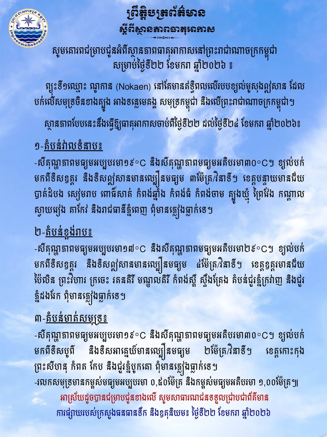 ក្រសួងធនធានទឹក ជូនដំណឹងអំពីស្ថានភាពធាតុអាកាសនៅកម្ពុជា សម្រាប់ថ្ងៃទី២២ ខែមករា ឆ្នាំ២០២៦