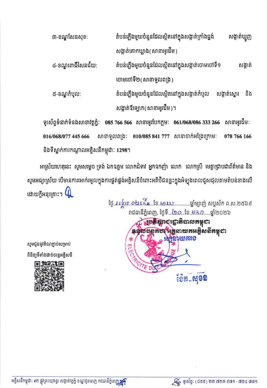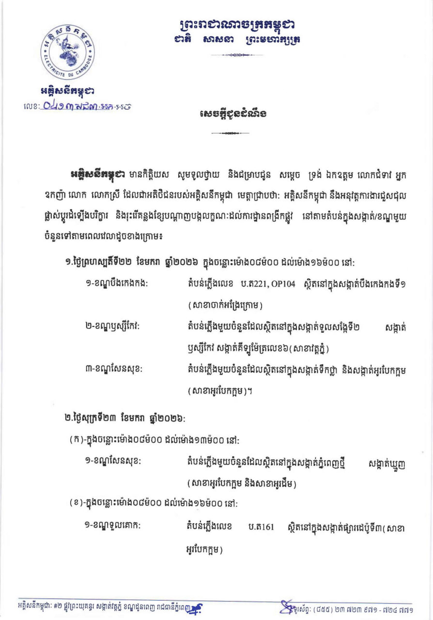 សូមអានសេចក្តីជូនដំណឹង របស់អគ្គិសនីកម្ពុជា ដូចខាងក្រោម ៖
