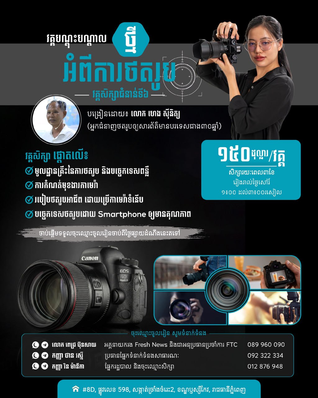 សម្រាប់អ្នកដែលមានបំណងពង្រឹងសមត្ថភាព និងចង់យល់ដឹងជ្រាលជ្រៅអំពីជំនាញថតរូបអាជីព អាចចុះឈ្មោះចូលរៀនបានចាប់ពីពេលនេះតទៅ តាមរយៈលេខទំនាក់ទំនងដែលបានបញ្ជាក់ខាងក្រោម៖