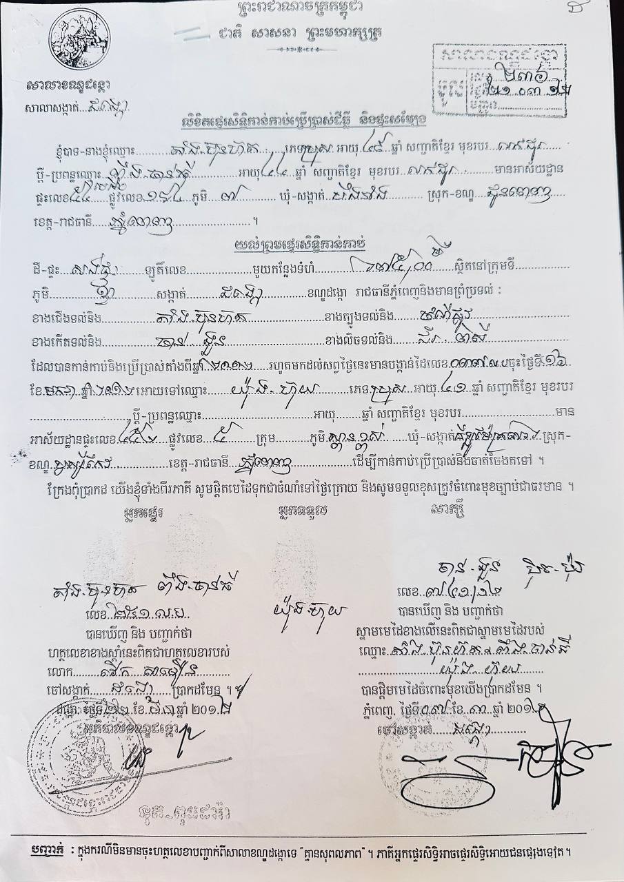 ប្រជាពលរដ្ឋរស់នៅខណ្ឌដង្កោបាត់លិខិតផ្ទេរសិទ្ធកាន់កាប់ប្រើប្រាស់ដីធ្លីនិងផ្ទះសម្បែងហើយមិនទទួលខុសត្រូវចំពោះអ្នកដែលរើសបានយកទៅប្រើប្រាស់ខុសច្បាប់