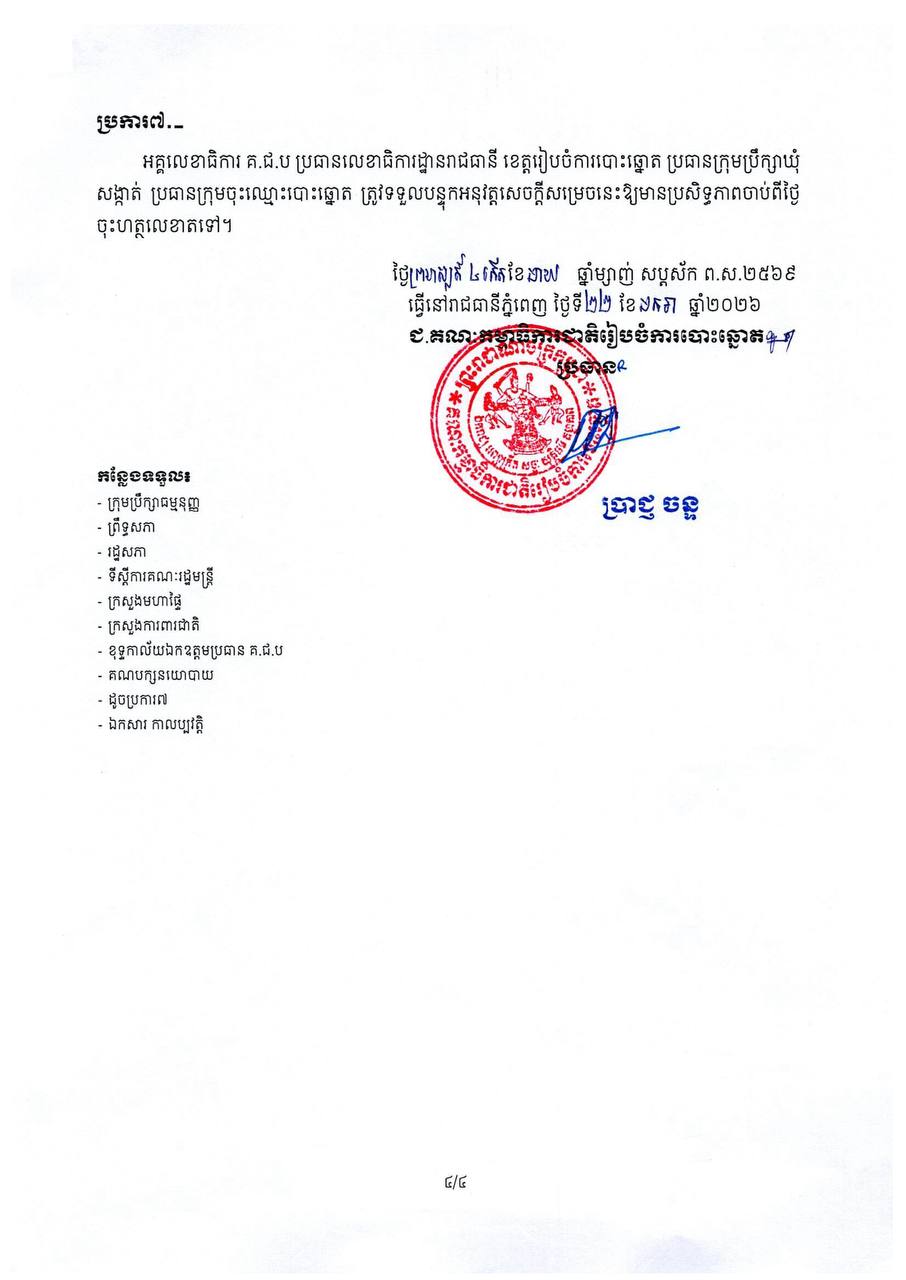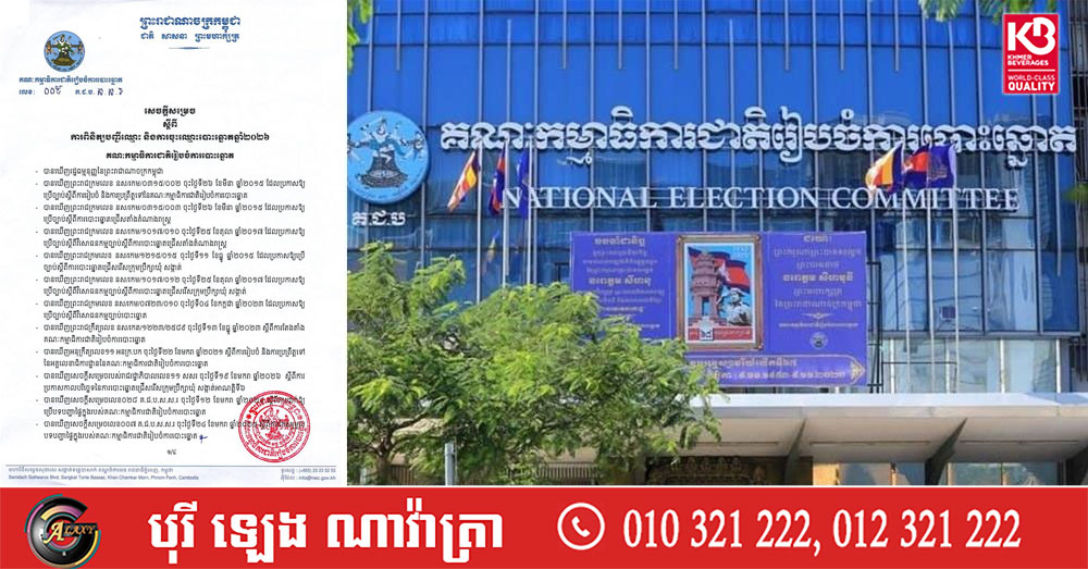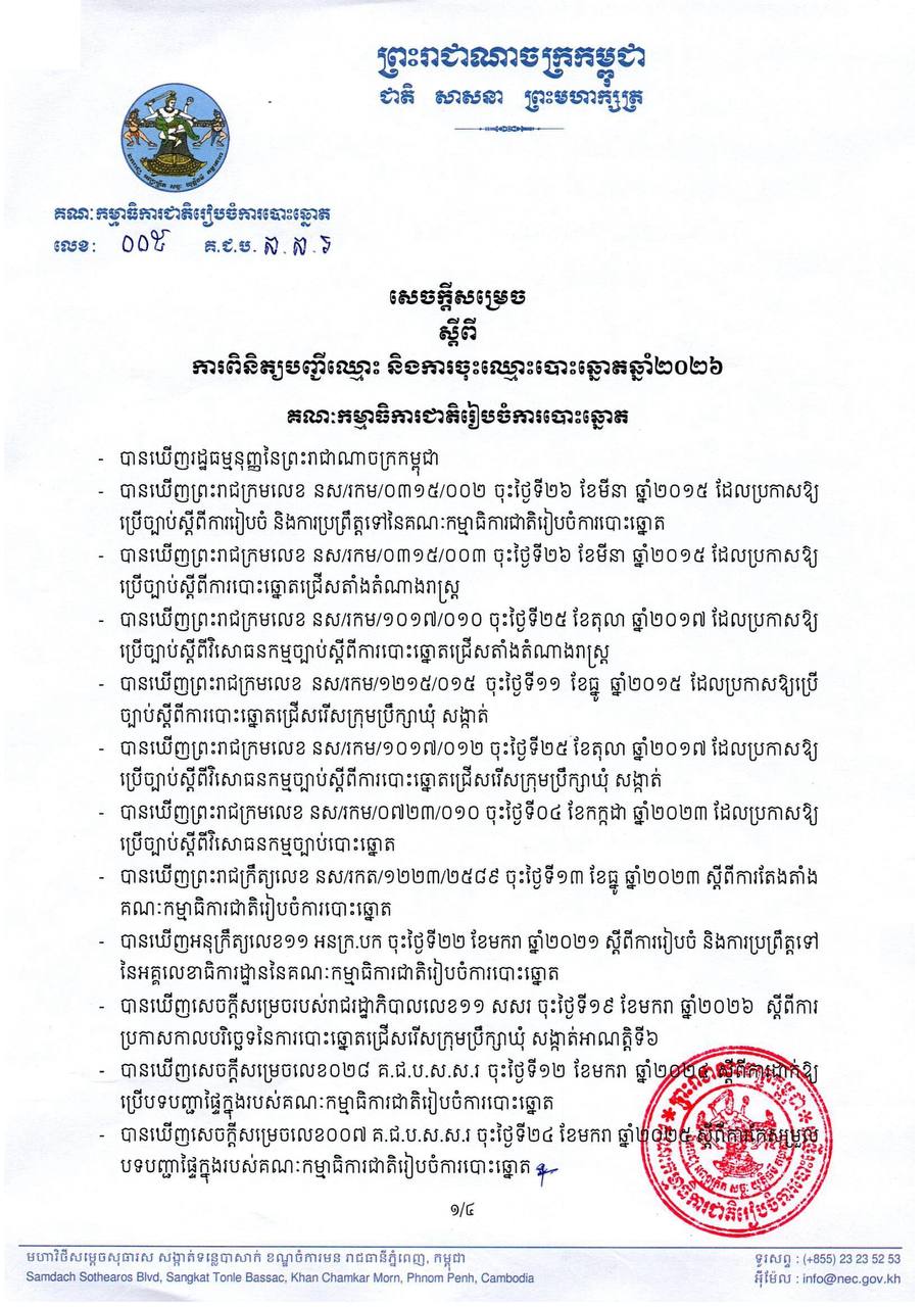 (ភ្នំពេញ)៖ គណៈកម្មាធិការជាតិរៀបចំការបោះឆ្នោត នៅថ្ងៃទី២២ ខែមករា ឆ្នាំ២០២៦នេះ បានចេញសេចក្ដីសម្រេចស្ដីពីការពិនិត្យបញ្ជីឈ្មោះ និងការចុះឈ្មោះបោះឆ្នោត ឆ្នាំ២០២៦ ដើម្បីរៀបចំបញ្ជីឈ្មោះបោះឆ្នោតសម្រាប់ប្រើប្រាស់ក្នុងការបោះឆ្នោតជ្រើសរើសក្រុមប្រឹក្សាឃុំសង្កាត់ អាណត្តិទី៦ ឆ្នាំ២០២៧ និងតាមការកំណត់នៃច្បាប់។