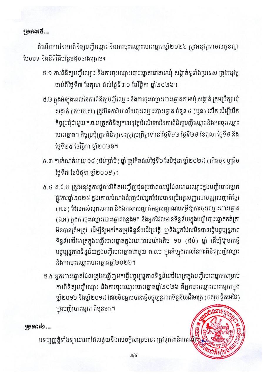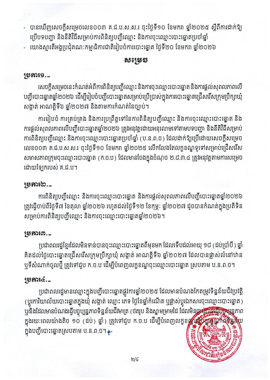 គ.ជ.ប ចេញសេចក្ដីសម្រេច ស្ដីពីការពិនិត្យបញ្ជីឈ្មោះ និងការចុះឈ្មោះបោះឆ្នោត ឆ្នាំ២០២៦