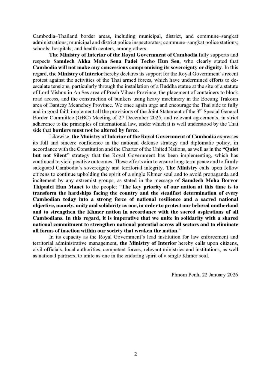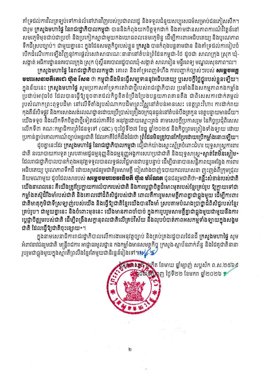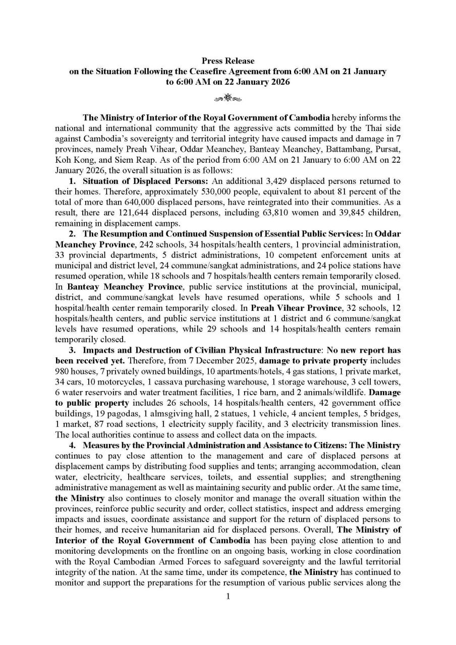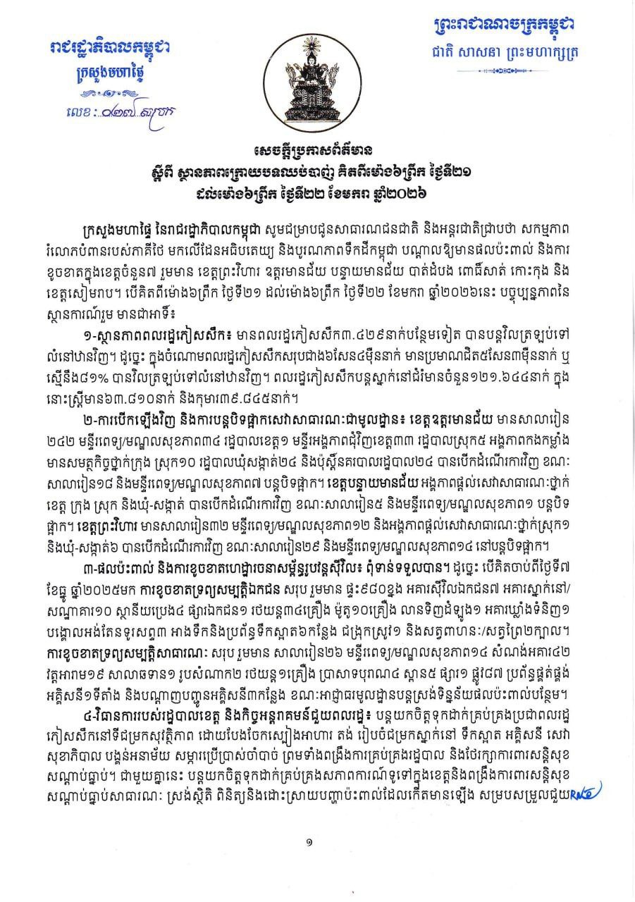 (ភ្នំពេញ)៖ ក្រសួងមហាផ្ទៃ បានបញ្ជាក់ឲ្យដឹងថា គិតមកត្រឹមព្រឹកថ្ងៃទី២២ ខែមករា ឆ្នាំ២០២៦នេះ មានពលរដ្ឋភៀសសឹក ៣,៤២៩នាក់បន្ថែមទៀត បានបន្តវិលត្រឡប់ទៅលំនៅឋានវិញ។ ក្នុងចំណោមពលរដ្ឋភៀសសឹកសរុបជាង ៦សែន ៤ម៉ឺននាក់ មានប្រមាណជិត៥សែន៣ម៉ឺននាក់ ឬស្មើនឹង ៨១% បានវិលត្រឡប់ទៅលំនៅឋានវិញ។