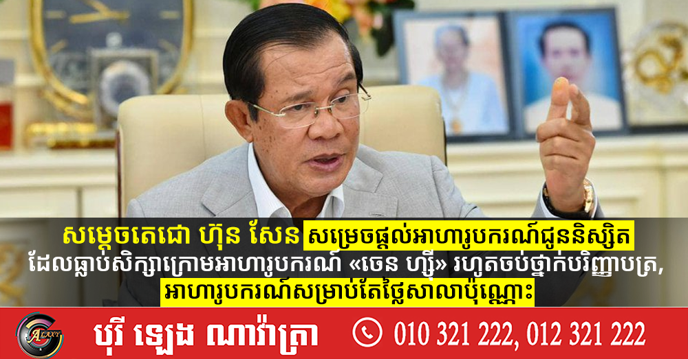 (ភ្នំពេញ)៖ សម្តេចតេជោ ហ៊ុន សែន ប្រធានព្រឹទ្ធសភាកម្ពុជា បានសម្រេចផ្តល់អាហារូបករណ៍ជូននិស្សិតចំនួន ៤១៨រូប ដែលធ្លាប់សិក្សាក្រោមអាហារូបករណ៍ «ចេន ហ្ស៊ី» ឱ្យបន្តការសិក្សានៅតាមសាកលវិទ្យាល័យនានារហូតដល់ចប់ថ្នាក់បរិញ្ញាបត្រ។ អាហារូបករណ៍នេះ គឺសម្រាប់តែថ្លៃសាលាប៉ុណ្ណោះ ដោយឡែកប្រាក់ឧបត្ថម្ភប្រចាំខែមិនមាននោះឡើយ។