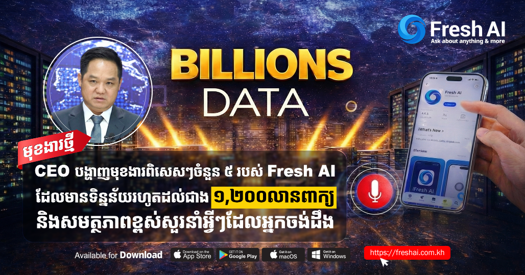CEO បង្ហាញមុខងារពិសេសៗចំនួន ៥ របស់ «Fresh AI» ដែលមានទិន្នន័យរហូតដល់ជាង ១,២០០លានពាក្យ និងសមត្ថភាពខ្ពស់សួរនាំអ្វីៗដែលអ្នកចង់ដឹង