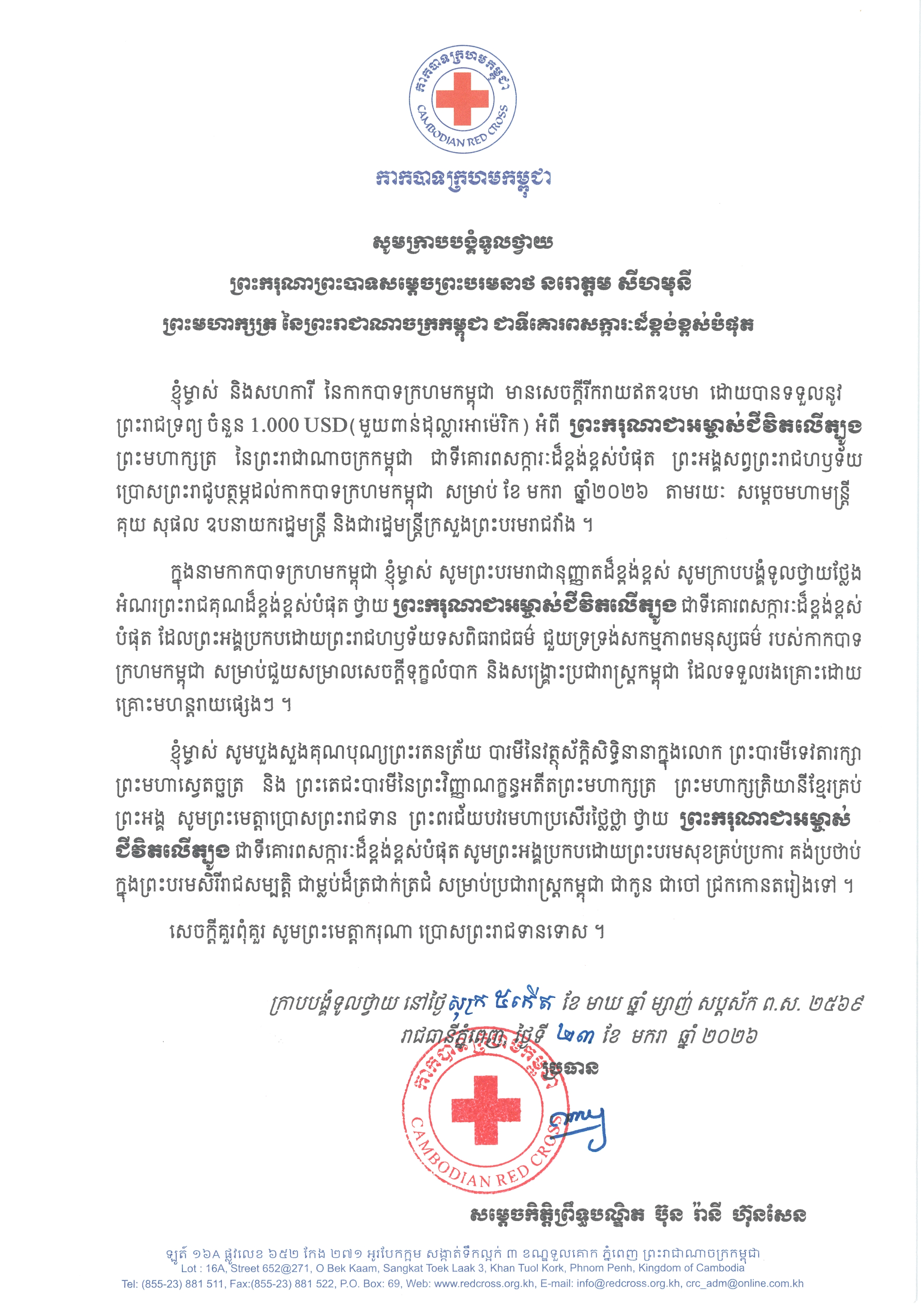 ក្នុងសារលិខិតនោះមានខ្លឹមសារថា «ខ្ញុំម្ចាស់ និងសហការី នៃកាកបាទក្រហមកម្ពុជា មានសេចក្តីរីករាយឥតឧបមា ដោយបានទទួលនូវ ព្រះរាជទ្រព្យ ចំនួន 1.000 USD (មួយពាន់ដុល្លារអាម៉េរិក) អំពី ព្រះករុណាជាអម្ចាស់ជីវិតលើត្បូង ព្រះមហាក្សត្រ នៃព្រះរាជាណាចក្រកម្ពុជា ជាទីគោរពសក្ការៈដ៏ខ្ពង់ខ្ពស់បំផុត ព្រះអង្គសព្វព្រះរាជហឫទ័យ ប្រោសព្រះរាជូបត្ថម្ភដល់កាកបាទក្រហមកម្ពុជា សម្រាប់ ខែមករា ឆ្នាំ២០២៦ តាមរយៈ សម្តេចមហាមន្ត្រី គុយ សុផល ឧបនាយករដ្ឋមន្ត្រី និងជារដ្ឋមន្ត្រីក្រសួងព្រះបរមរាជវាំង ។