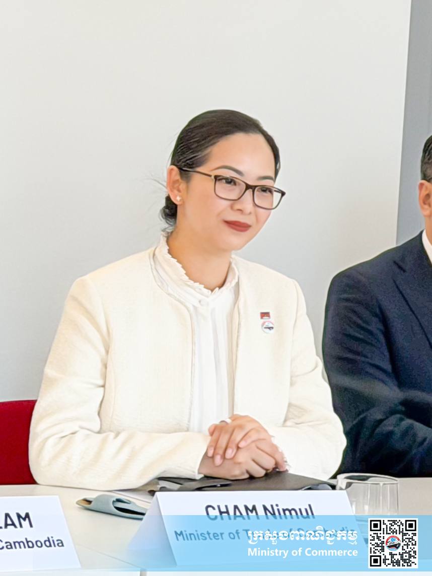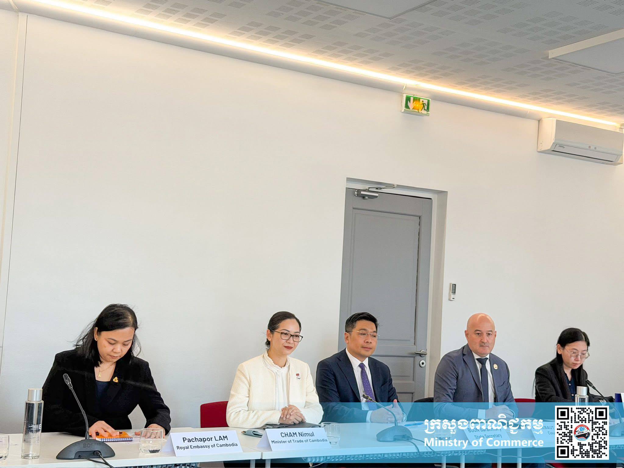 (ប៉ារីស)៖ លោកស្រី ចម និម្មល រដ្ឋមន្រ្តីក្រសួងពាណិជ្ជកម្ម នាព្រឹកថ្ងៃសុក្រ ទី២៣ ខែមករា ឆ្នាំ២០២៦ នៅទីក្រុងប៉ារីស បានទទួលជួបពិភាក្សាការងារ ជាមួយលោក François Corbin អនុប្រធានសមាគមធុរកិច្ច MEDEF International និងតំណាងក្រុមហ៊ុនបារំាងធំៗចំនួន៦ ដើម្បីបង្ហាញពីសក្តានុពលពាណិជ្ជកម្ម និងវិនិយោគរបស់កម្ពុជា។