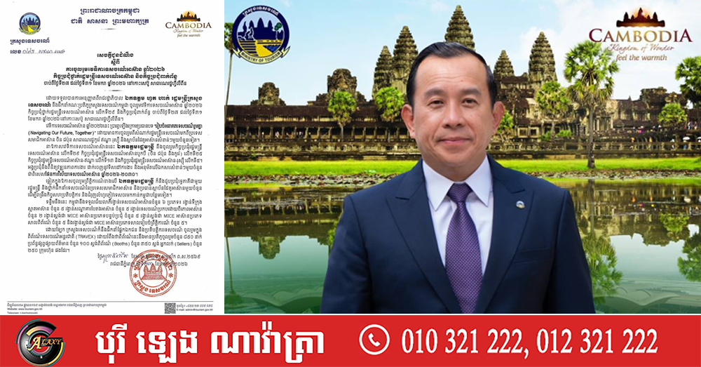 (ភ្នំពេញ)៖ ក្រសួងទេសចរណ៍ ចេញសេចក្ដីជូនដំណឹង ស្តីពី «ការចូលរួមវេទិកាទេសចរណ៍អាស៊ាន ឆ្នាំ២០២៦» កិច្ចប្រជុំថ្នាក់រដ្ឋមន្ត្រីទេសចរណ៍អាស៊ាន និងកិច្ចប្រជុំពាក់ព័ន្ធ រយៈពេល៤ថ្ងៃ ចាប់ពីថ្ងៃទី២៧ ដល់ថ្ងៃទី៣១ ខែមករា ឆ្នាំ២០២៦ នៅកោះសេប៊ូ សាធារណរដ្ឋហ្វីលីពីន។