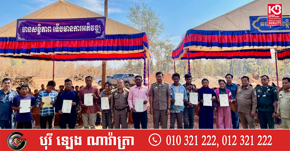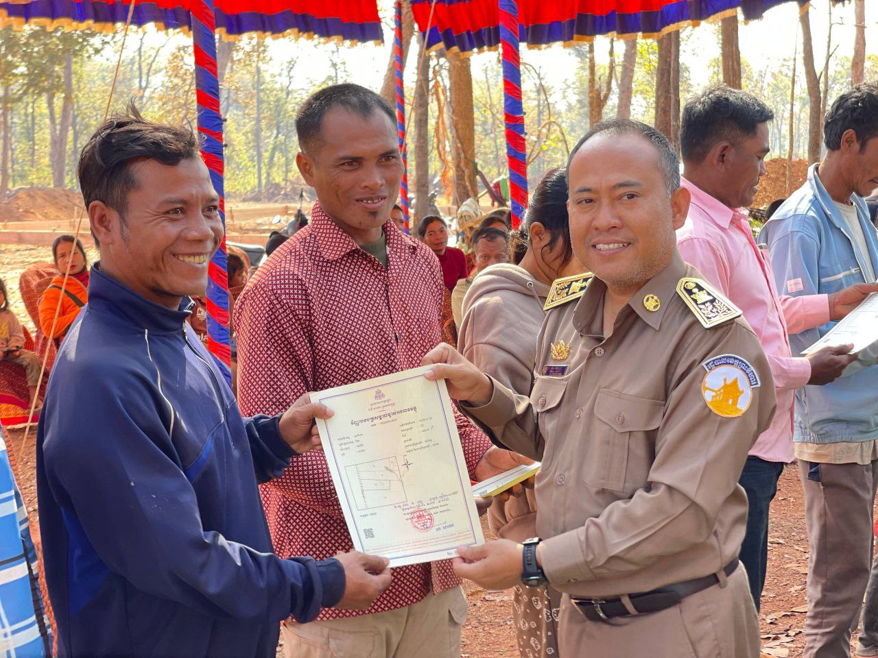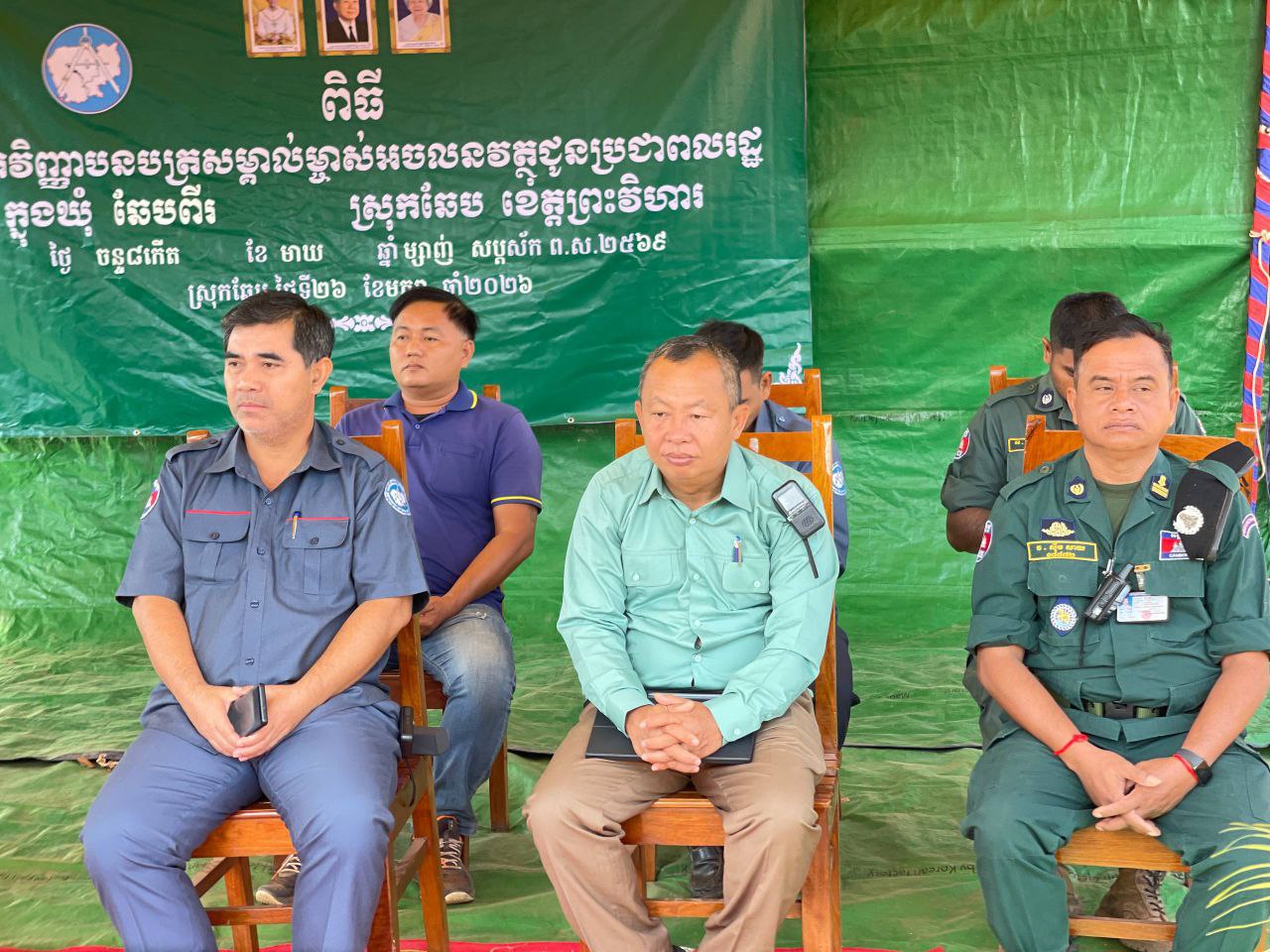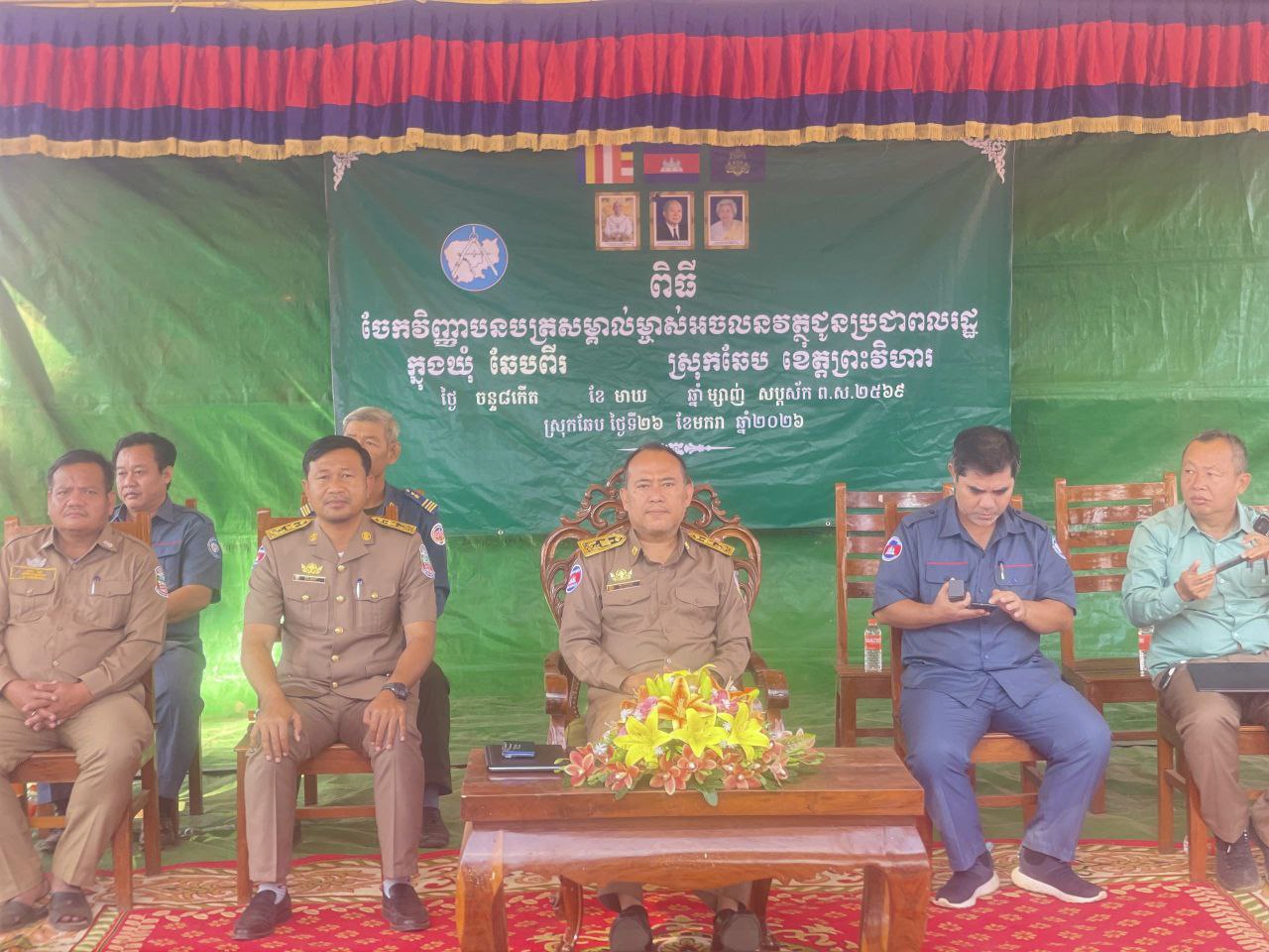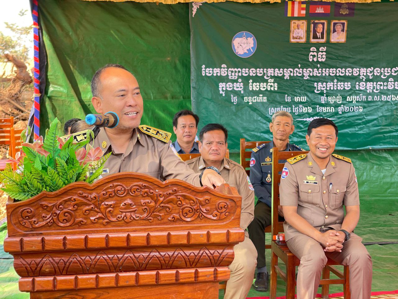 (ព្រះវិហារ)៖ លោក គឹម ចាន់បញ្ញា អភិបាលរងខេត្តព្រះវិហារ តំណាងលោក គីម រិទ្ធី អភិបាលខេត្ត ដោយមានការចូលរួមពីមន្ទីរ អង្គភាពជុំវិញខេត្ត និងអាជ្ញាធរស្រុកឆែប នៅថ្ងៃទី២៦ ខែមករា ឆ្នាំ២០២៦ បានអញ្ជើញចុះចែកបណ្ណកម្មសិទ្ធិដីធ្លីជូនប្រជាពលរដ្ឋចំនួន៦៧គ្រួសារ រស់នៅភូមិដងផ្លិត និងភូមិណារ៉ុង ឃុំឆែបពីរ ស្រុកឆែប ខេត្តព្រះវិហារ។