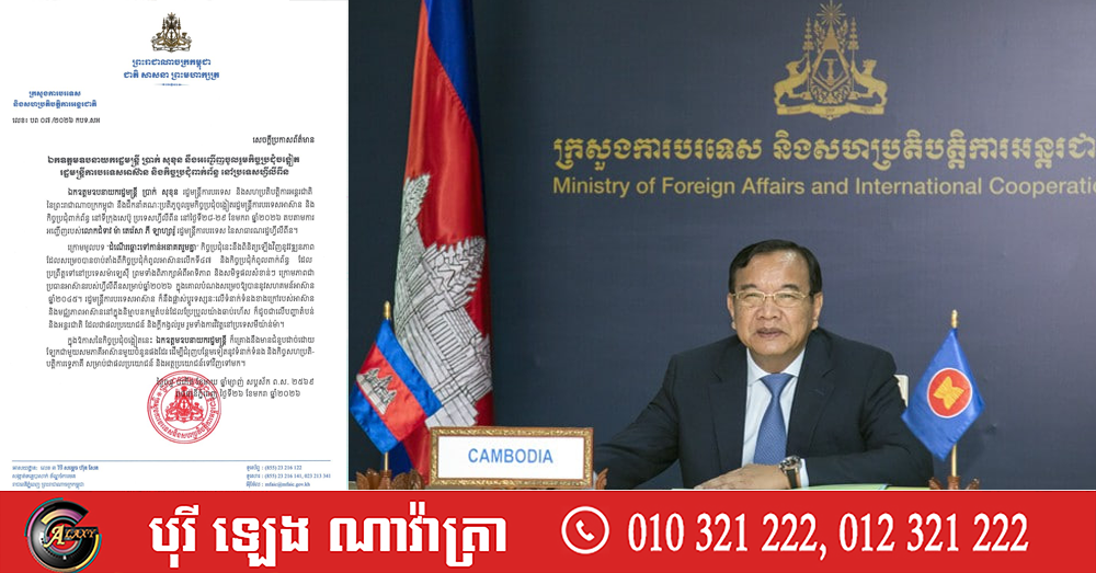 (ភ្នំពេញ)៖ ឧបនាយករដ្ឋមន្ត្រី ប្រាក់ សុខុន រដ្ឋមន្ត្រីការបរទេស និងសហប្រតិបត្តិការអន្តរជាតិ នឹងដឹកនាំគណៈប្រតិភូចូលរួមកិច្ចប្រជុំចង្អៀតរដ្ឋមន្ត្រីការបរទេសអាស៊ាន និងកិច្ចប្រជុំពាក់ព័ន្ធ នៅទីក្រុងសេប៊ូ ប្រទេសហ្វីលីពីន នៅថ្ងៃទី២៨-២៩ ខែមករា ឆ្នាំ២០២៦ តបតាមការអញ្ជើញរបស់លោកស្រី ម៉ា តេរ៉េសា ភី ឡាហ្សារ៉ូ រដ្ឋមន្ត្រីការបរទេស នៃសាធារណរដ្ឋហ្វីលីពីន។