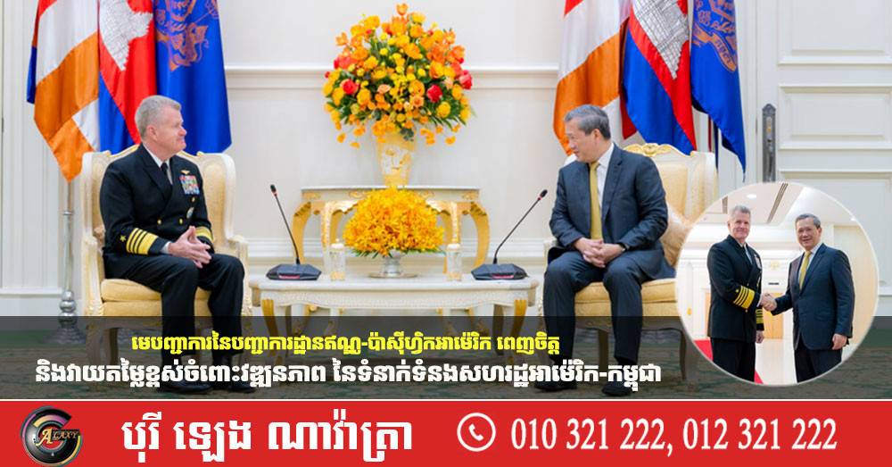 (ភ្នំពេញ)៖ នាព្រឹកថ្ងៃទី២៦ ខែមករា ឆ្នាំ២០២៦នេះ សម្តេចមហាបវរធិបតី ហ៊ុន ម៉ាណែត នាយករដ្ឋមន្ត្រីនៃកម្ពុជា បានអនុញ្ញាតឲ្យ នាយឧត្តមនាវី Samuel Paparo មេបញ្ជាការនៃបញ្ជាការដ្ឋានឥណ្ឌូ-ប៉ាស៊ីហ្វិក នៃសហរដ្ឋអាម៉េរិក ចូលជួបសម្តែងការគួរសម និងពិភាក្សាការងារ នៅវិមានសន្តិភាព។