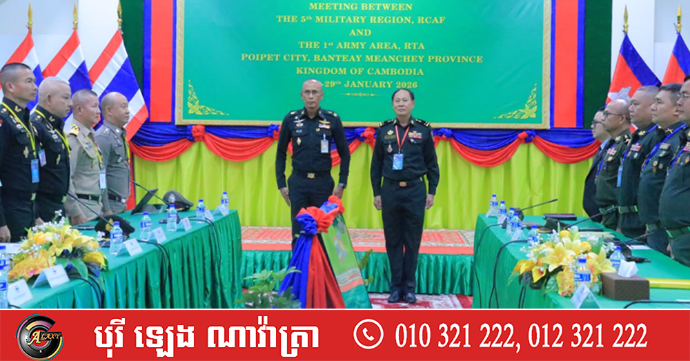 (ភ្នំពេញ)៖ កិច្ចប្រជុំក្រុមលេខាធិការដ្ឋាននៃគណៈកម្មាធិការព្រំដែនថ្នាក់យោធភូមិភាគកម្ពុជា-ថៃ (RBC) យោធភូមិភាគទី៥ ភាគីកម្ពុជា និងកងទ័ពភូមិភាគទី១ ភាគីថៃ បានចាប់ផ្តើមកិច្ចប្រជុំរបស់ខ្លួនហើយ នាវេលាម៉ោង ១៤:០០នាទី រសៀលថ្ងៃទី២៧ ខែមករា ឆ្នាំ២០២៦នេះ នៅច្រកអន្តរជាតិប៉ោយប៉ែត ខេត្តបន្ទាយមានជ័យ ព្រះរាជាណាចក្រកម្ពុជា ទល់នឹងខេត្តស្រះកែវ ព្រះរាជាណាចក្រថៃ។