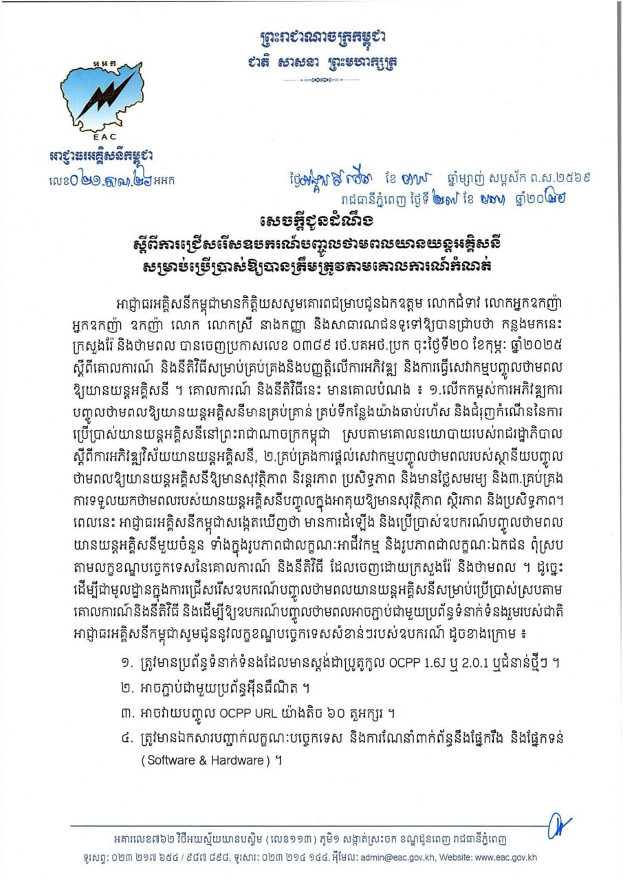(ភ្នំពេញ)៖ អាជ្ញាធរអគ្គិសនីកម្ពុជា បានចេញសេចក្ដីជូនដំណឹង ស្តីពី «ការជ្រើសរើសឧបករណ៍បញ្ចូលថាមពលយានយន្តអគ្គិសនី សម្រាប់ប្រើប្រាស់ឱ្យបានត្រឹមត្រូវ តាមគោលការណ៍កំណត់»។ នេះបើតាមសេចក្ដីជូនដំណឹង ដែលបណ្ដាញព័ត៌មាន Fresh News ទទួលបាននៅថ្ងៃទី២៧ ខែមករា ឆ្នាំ២០២៦៕
