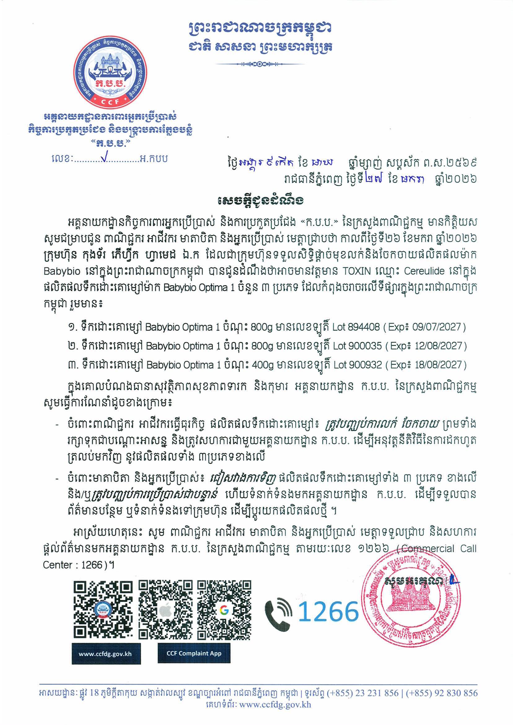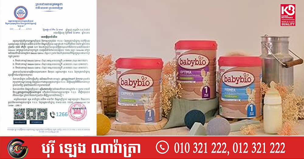 (ភ្នំពេញ)៖ អគ្គនាយកដ្ឋានកិច្ចការពារអ្នកប្រើប្រាស់ និងការប្រកួតប្រជែង «ក.ប.ប.» នៃក្រសួងពាណិជ្ជកម្ម បានប្រកាសដល់ពាណិជ្ជករ អាជីវករ មាតាបិតា និងអ្នកប្រើប្រាស់ឱ្យដឹងថា កាលពីថ្ងៃទី២៦ ខែមករា ឆ្នាំ២០២៦ ក្រុមហ៊ុន កុងទ័រ ភើហ្វីក ហ្វាមេដ ឯ.ក ដែលជាក្រុមហ៊ុនទទួលសិទ្ធិផ្តាច់មុខលក់និងចែកចាយផលិតផលម៉ាក Babybio នៅក្នុងព្រះរាជាណាចក្រកម្ពុជា បានជូនដំណឹងថាអាចមានវត្តមាន TOXIN ឈ្មោះ Cereulide នៅក្នុងផលិតផលទឹកដោះគោម្សៅម៉ាក Babybio Optima 1 ចំនួន ៣ប្រភេទ ដែលកំពុងចរាចរលើទីផ្សារក្នុងព្រះរាជាណាចក្រកម្ពុជារួមមាន៖
