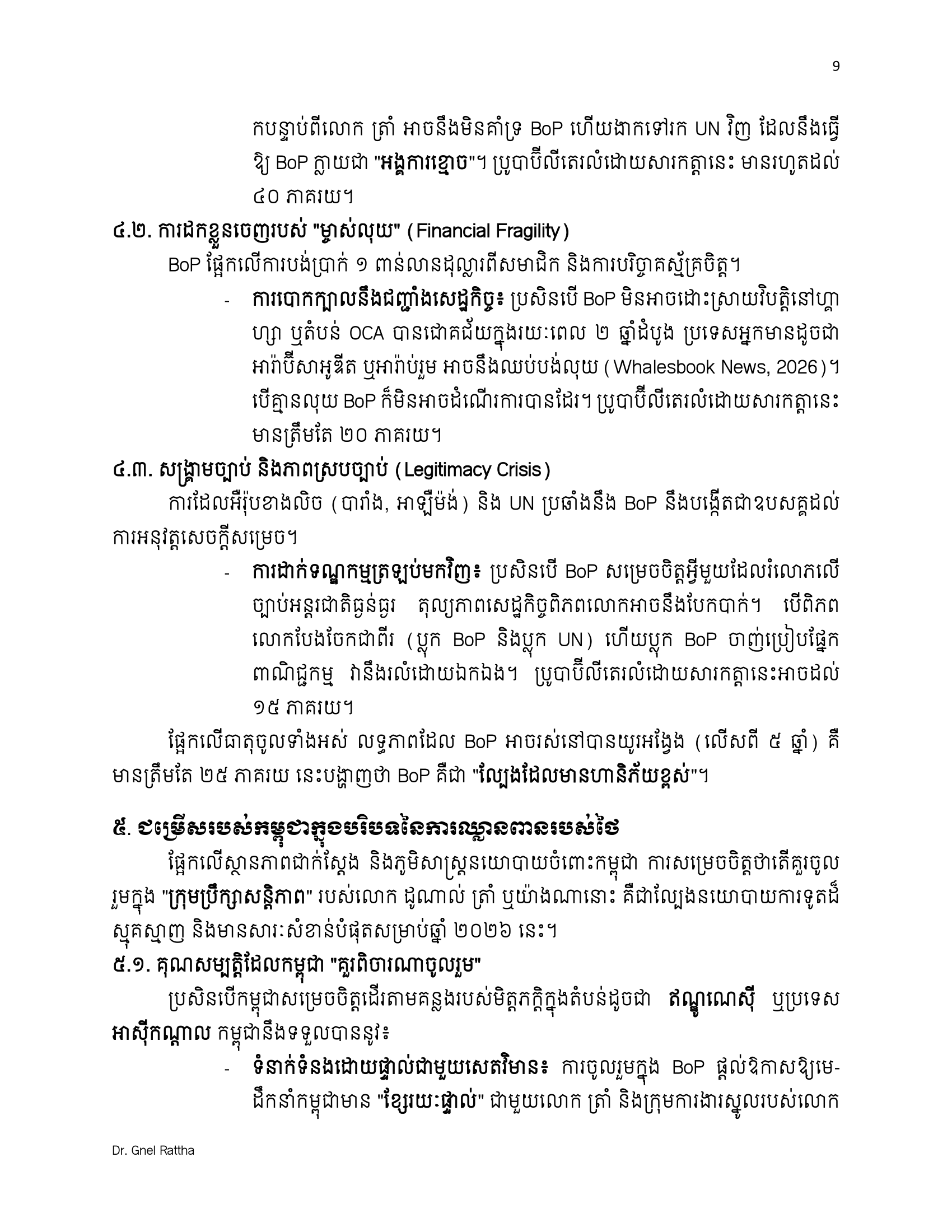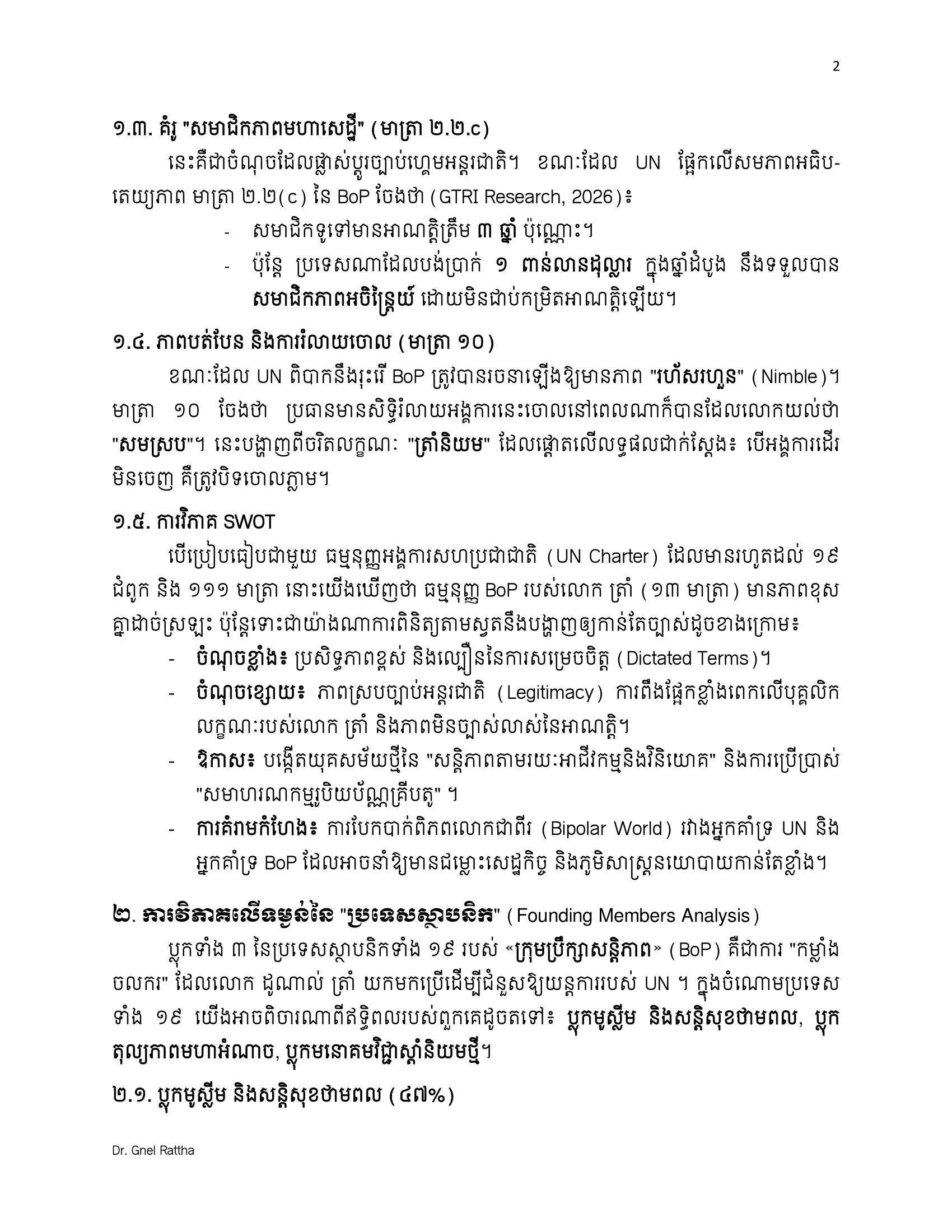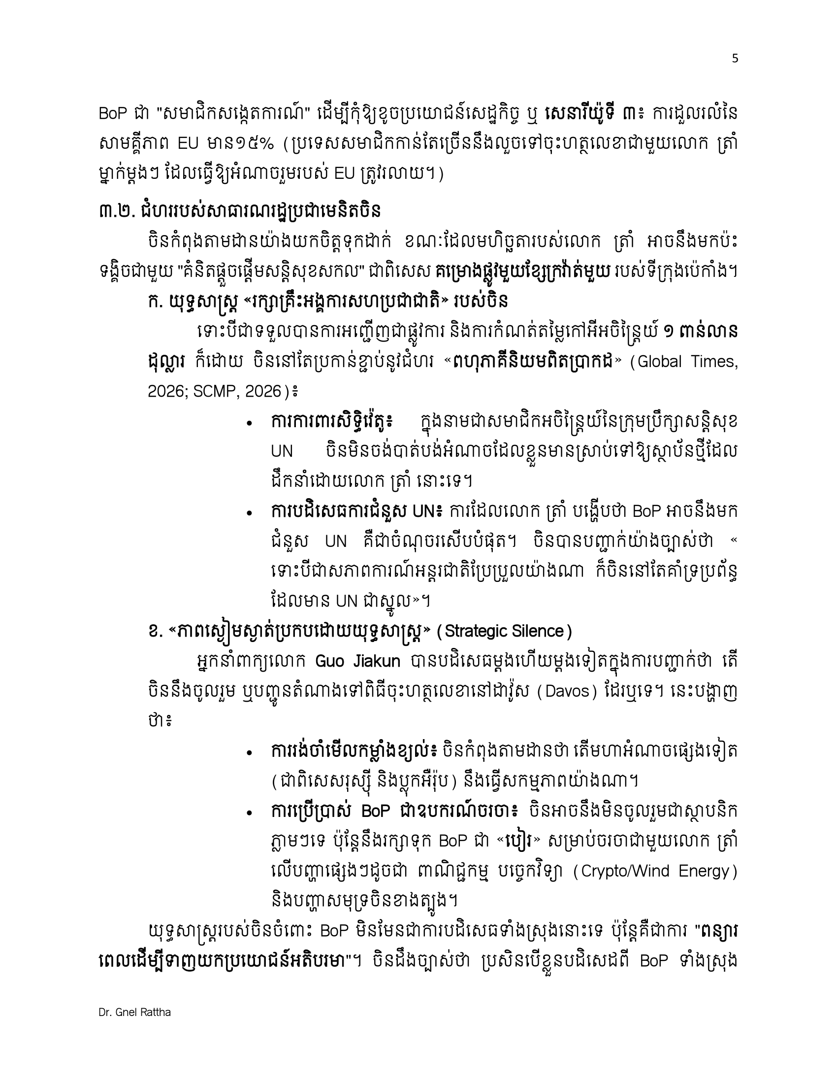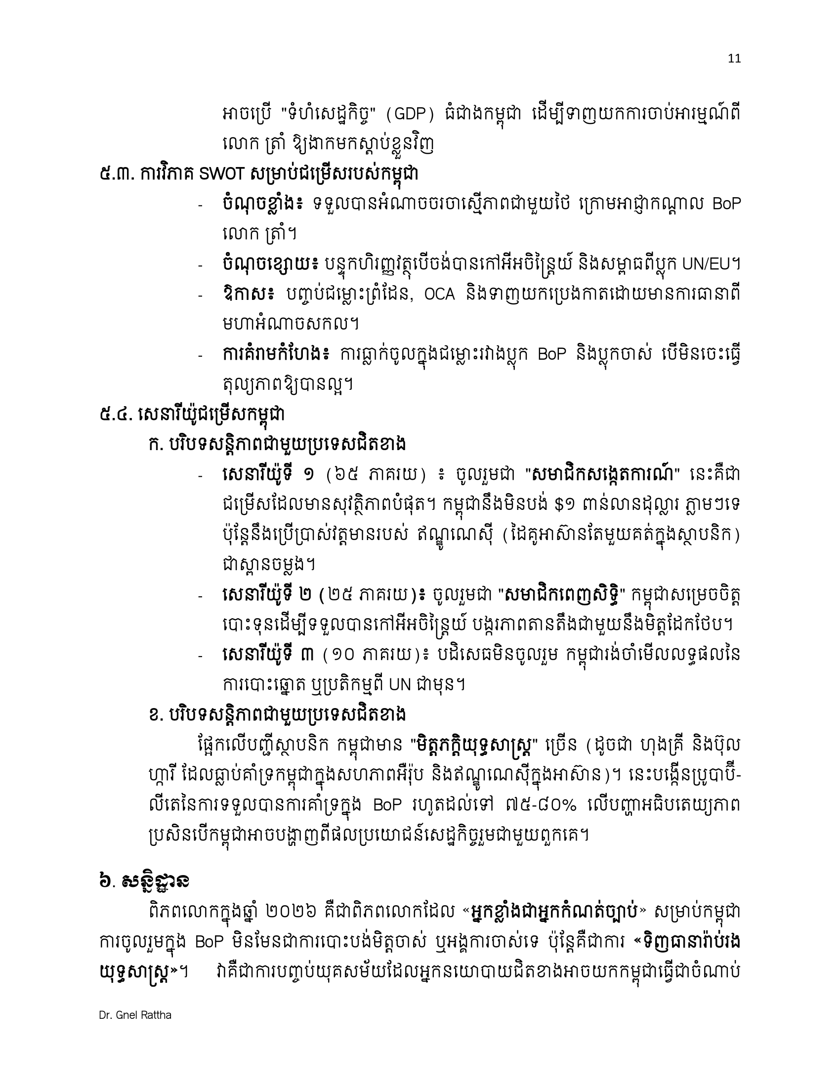 លោកបណ្ឌិត ញិល រដ្ឋា បានលើកឡើងថា ពិភពលោកក្នុងឆ្នាំ២០២៦ គឺជាពិភពលោកដែល «អ្នកខ្លាំងជាអ្នកកំណត់ច្បាប់»។ សម្រាប់កម្ពុជា ការចូលរួមក្នុង BoP មិនមែនជាការបោះបង់មិត្តចាស់ ឬអង្គការចាស់ទេ ប៉ុន្តែគឺជាការ «ទិញធានារ៉ាប់រងយុទ្ធសាស្ត្រ»។ វាគឺជាការបញ្ចប់យុគសម័យដែលអ្នកនយោបាយជិតខាងអាចយកកម្ពុជាធ្វើជាចំណាប់ខ្មាំងសន្លឹកឆ្នោត ហើយឈានទៅរកយុគសម័យដែលសន្តិភាព និងការអភិវឌ្ឍ ត្រូវបានការពារដោយកិច្ច ព្រមព្រៀងអំណាចពិតប្រាកដ។