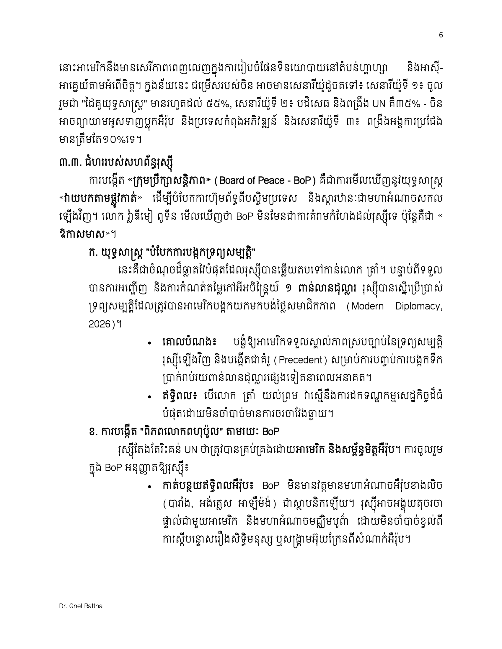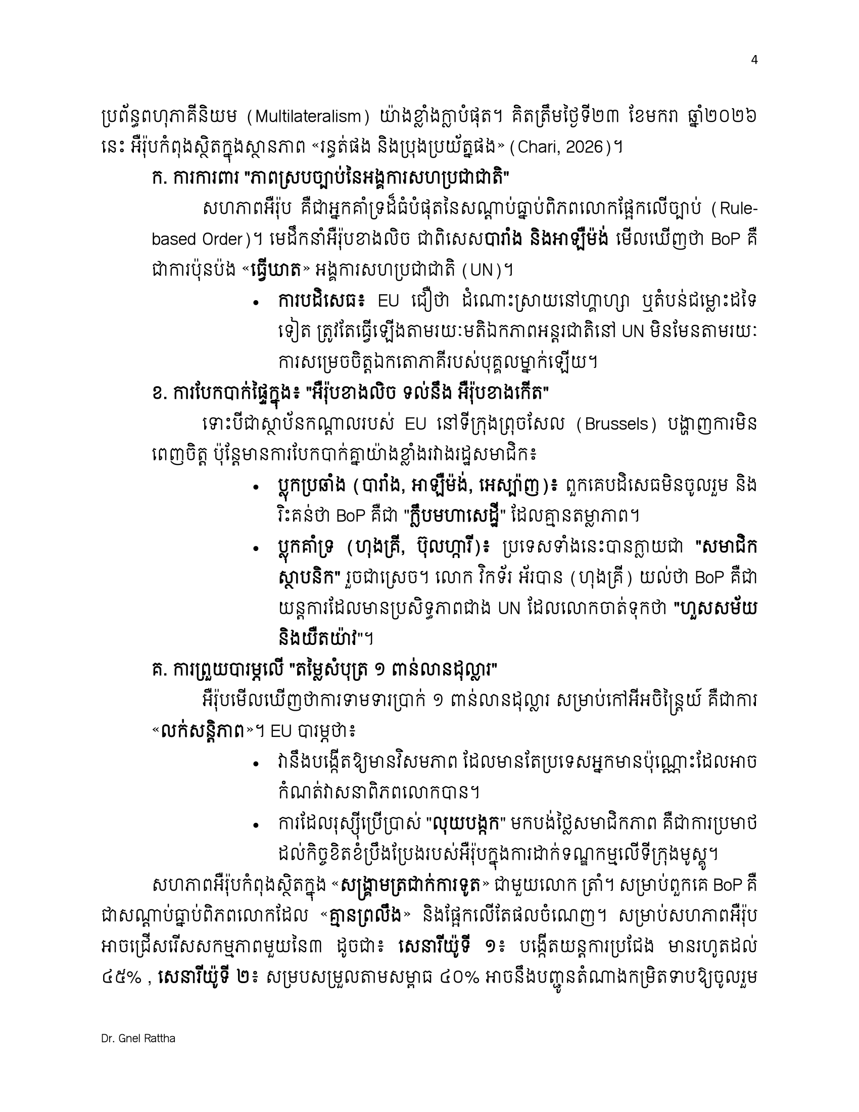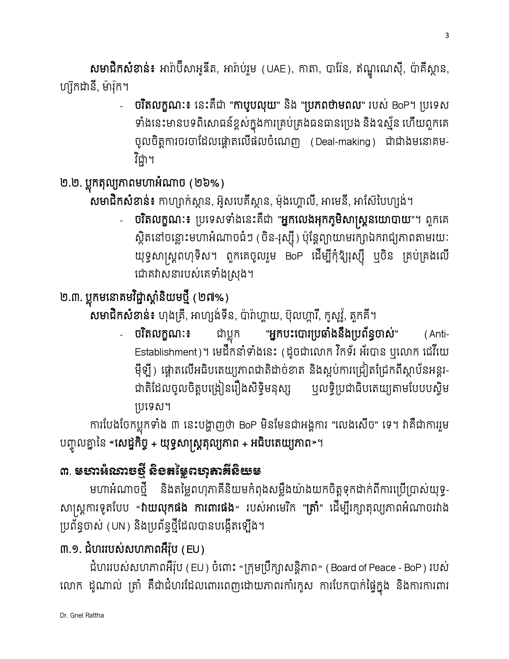(ភ្នំពេញ)៖ លោកបណ្ឌិត ញិល រដ្ឋា អ្នកជំនាញវិទ្យាសាស្ត្រនយោបាយ និងទំនាក់ទំនងអន្តរជាតិ បានលើកឡើងថា ការចូលរួមជាសមាជិកស្ថាបនិកនៃក្រុមប្រឹក្សាសន្តិភាព ឬ BoP (The Board of Peace) មិនមែនជាការបោះបង់មិត្តចាស់ ឬអង្គការចាស់ទេ ប៉ុន្តែគឺជាការ «ទិញធានារ៉ាប់រងយុទ្ធសាស្ត្រ»។