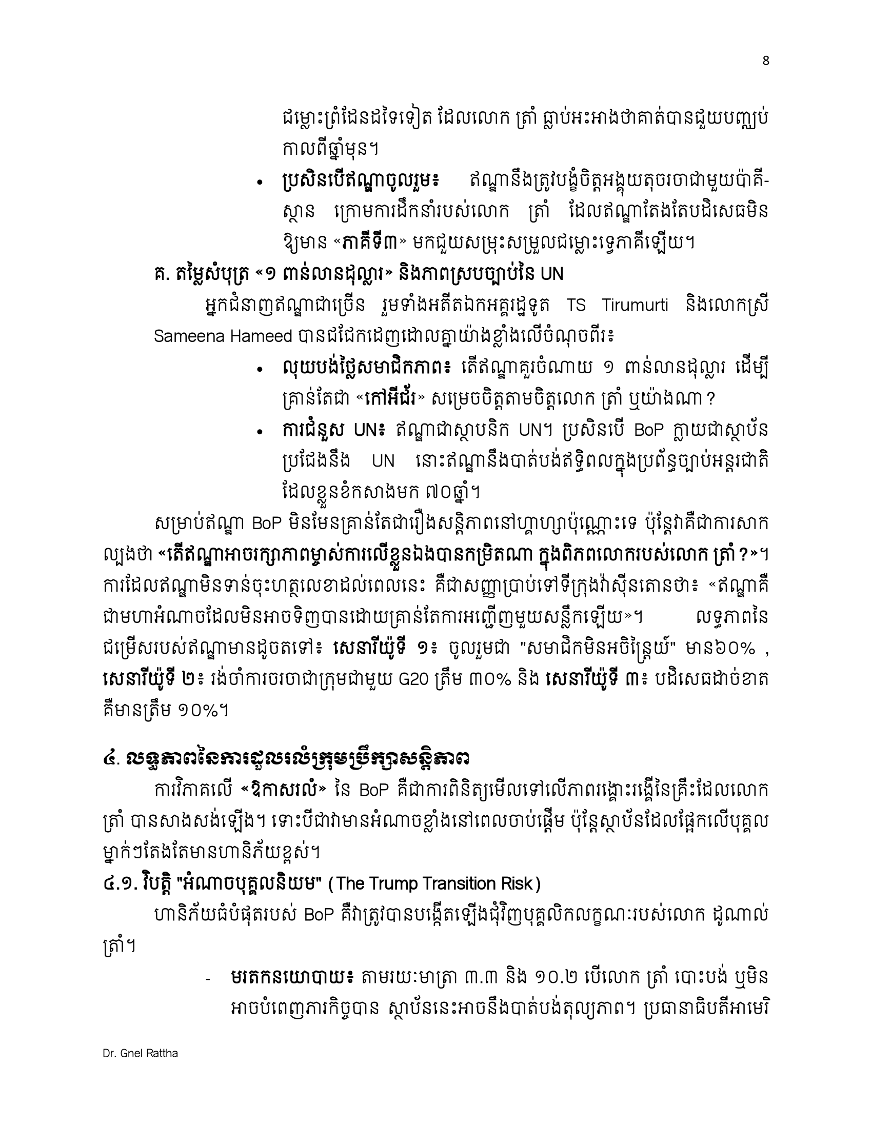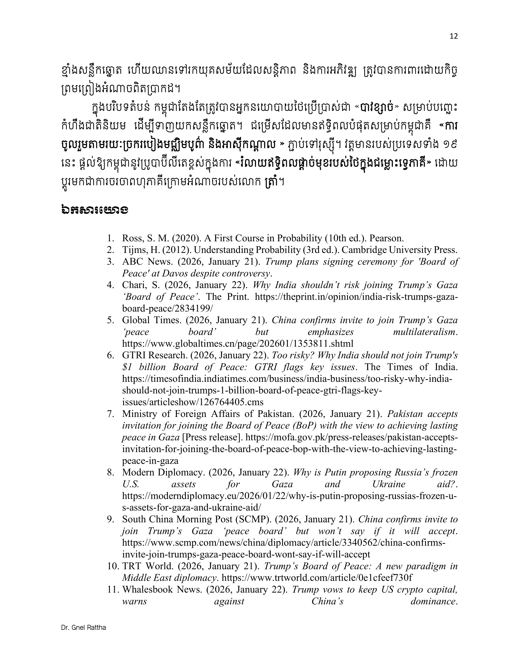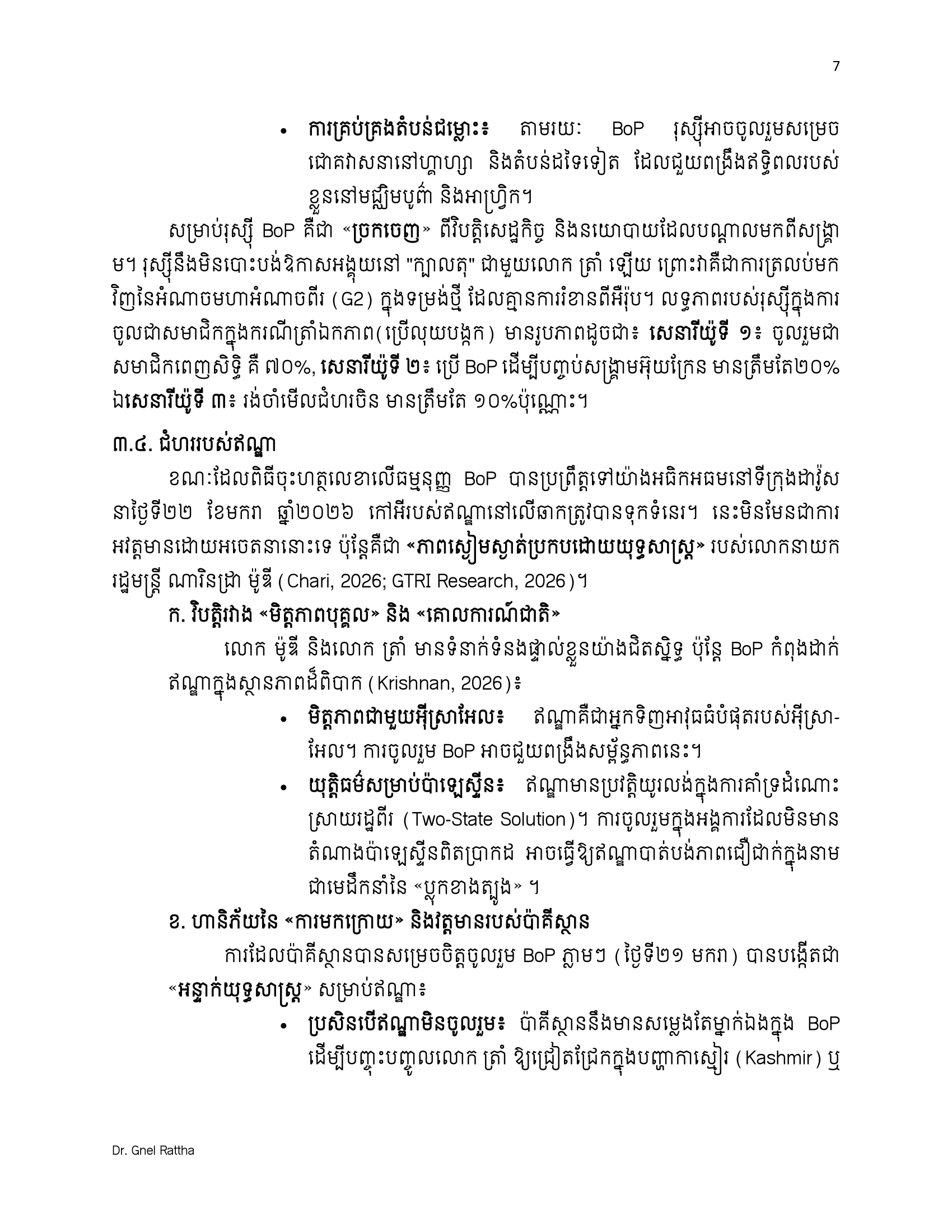 (ភ្នំពេញ)៖ លោកបណ្ឌិត ញិល រដ្ឋា អ្នកជំនាញវិទ្យាសាស្ត្រនយោបាយ និងទំនាក់ទំនងអន្តរជាតិ បានលើកឡើងថា ការចូលរួមជាសមាជិកស្ថាបនិកនៃក្រុមប្រឹក្សាសន្តិភាព ឬ BoP (The Board of Peace) មិនមែនជាការបោះបង់មិត្តចាស់ ឬអង្គការចាស់ទេ ប៉ុន្តែគឺជាការ «ទិញធានារ៉ាប់រងយុទ្ធសាស្ត្រ»។