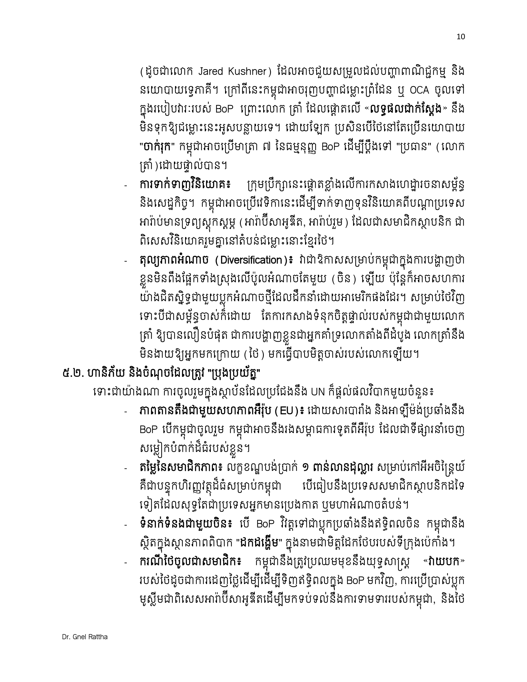 បើតាមលោកបណ្ឌិត ញិល រដ្ឋា ក្នុងបរិបទតំបន់ កម្ពុជាតែងតែត្រូវបានអ្នកនយោបាយថៃប្រើប្រាស់ជា «បាវខ្សាច់» សម្រាប់បញ្ឆេះ កំហឹងជាតិនិយម ដើម្បីទាញយកសន្លឹកឆ្នោត។ ជម្រើសដែលមានឥទ្ធិពលបំផុតសម្រាប់កម្ពុជាគឺ «ការចូលរួមតាមរយៈច្រករបៀងមជ្ឈិមបូព៌ា និងអាស៊ីកណ្តាល» ភ្ជាប់ទៅរុស្ស៊ី។ វត្តមានរបស់ប្រទេសទាំង ១៩ នេះ ផ្តល់ឱ្យកម្ពុជានូវប្រូបាប៊ីលីតេខ្ពស់ក្នុងការ «រំលាយឥទ្ធិពលផ្តាច់មុខរបស់ថៃក្នុងជម្លោះទ្វេភាគី» ដោយប្តូរមកជាការចរចាពហុភាគីក្រោមអំណាចរបស់លោក ត្រាំ៕
