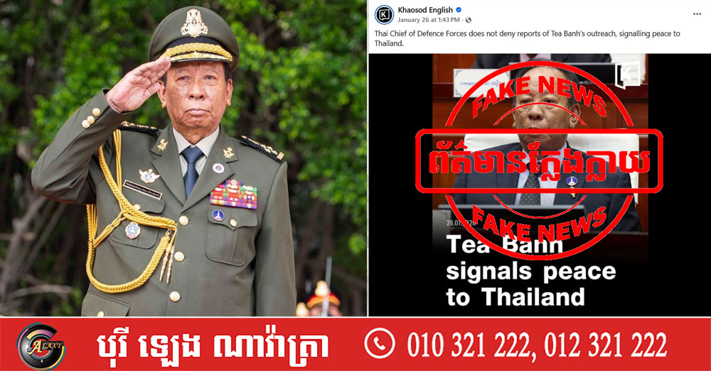 (ភ្នំពេញ)៖ នាថ្មីៗនេះមានសារព័ត៌មាន និងបណ្តាញសង្គមថៃមួយចំនួន បានផ្សព្វផ្សាយចោទប្រកាន់ សម្តេចពិជ័យសេនា ទៀ បាញ់ ដោយបំភ្លៃថា «សម្តេចបានទាក់ទងមកភាគីថៃ ដើម្បីសុំផ្អាកជម្លោះ» ឬ សម្តេចសុំកុំឱ្យភាគីថៃ វាយខ្មែរទៀត ព្រមបានបំភ្លៃជាសំឡេងសម្តេចនិយាយទៅកាន់កងទ័ពថៃថា «សម្តេចតេជោ ហ៊ុន សែន លើកទង់ជ័យស ព្រមចុះចាញ់» ជាដើម។