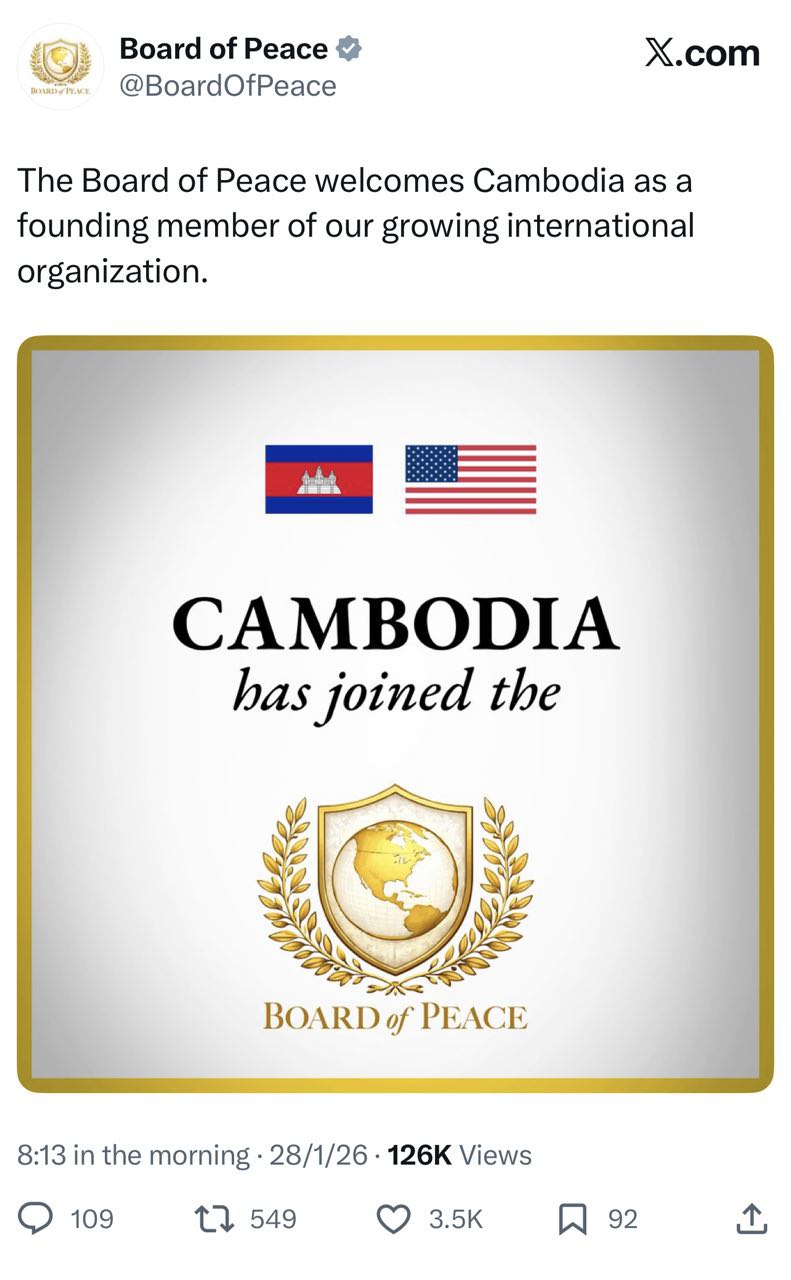 (ភ្នំពេញ)៖ នៅលើបណ្តាញសង្គម X ក្រុមប្រឹក្សាសន្តិភាព បានប្រកាសស្វាគមន៍កម្ពុជា ក្លាយជាសមាជិកស្ថាបនិក «ក្រុមប្រឹក្សាសន្តិភាព» ដែលផ្តួចផ្តើមបង្កើតឡើងដោយលោក ដូណាល់ ត្រាំ ប្រធានាធិបតីអាមេរិក។