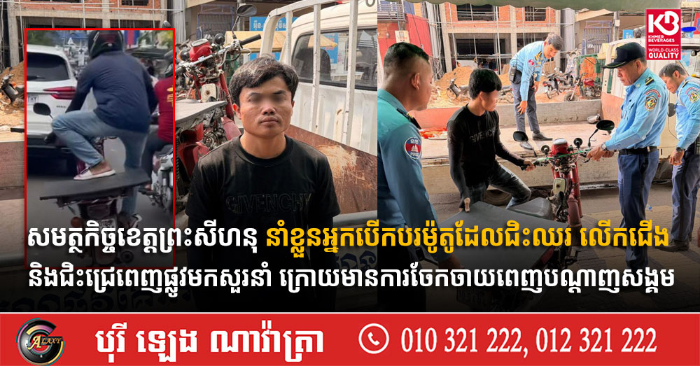 សមត្ថកិច្ចខេត្តព្រះសីហនុ នាំខ្លួនអ្នកបើកបរម៉ូតូដែលជិះឈរ លើកជើង និងជិះជ្រេពេញផ្លូវមកសួរនាំ ក្រោយមានការចែកចាយពេញបណ្តាញសង្គម