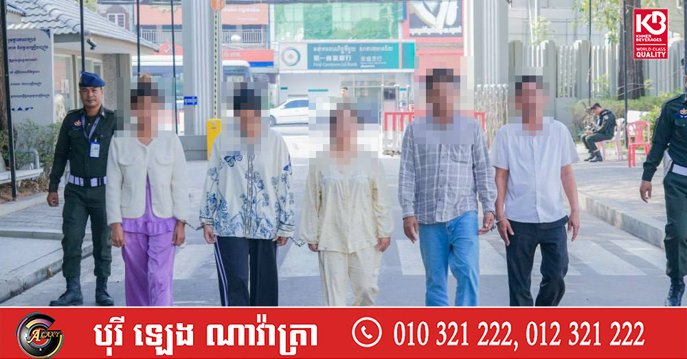 ១- ឈ្មោះ ផេង សុខឡៃ ភេទស្រី អាយុ៤៤ឆ្នាំ,២-ឈ្មោះ អឿន សំអន ភេទប្រុស អាយុ៤៧ឆ្នាំ, ៣-ឈ្មោះ តុង យុទ្ធ ភេទប្រុស អាយុ៥០ឆ្នាំ, ៤-ឈ្មោះ ទ្រី ស៊ីម៉ា ភេទស្រី អាយុ២៣ឆ្នាំ, ៥-ឈ្មោះ ទុយ ម៉ែងហ័ង ភេទស្រី អាយុ១៩ឆ្នាំ។ ចំណែកឯអ្នកមិនពាក់ព័ន្ធចំនួន០៣នាក់ទៀត បានអនុញ្ញាតឲ្យវិលត្រឡប់ទៅលំនៅដ្ឋានវិញ។