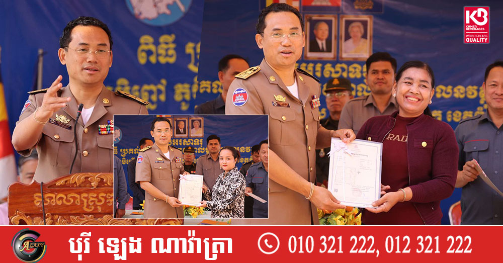 អភិបាលខេត្តកំពង់ធំ ចែកវិញ្ញាបនបត្រសម្គាល់ម្ចាស់អចលនវត្ថុចំនួន២៥៥១បណ្ណ ជូនដល់ប្រជាពលរដ្ឋនៅឃុំព្នៅ ស្រុកសន្ទុក