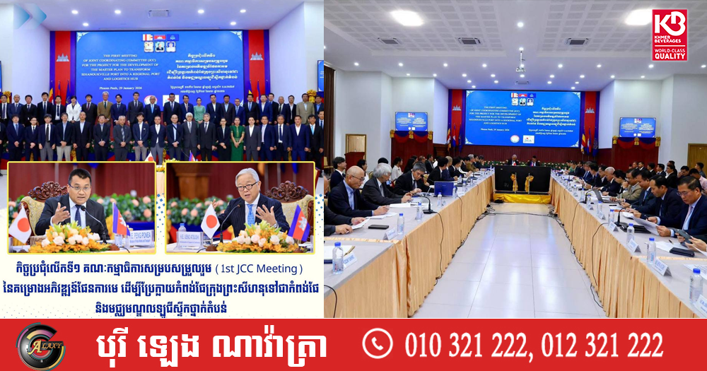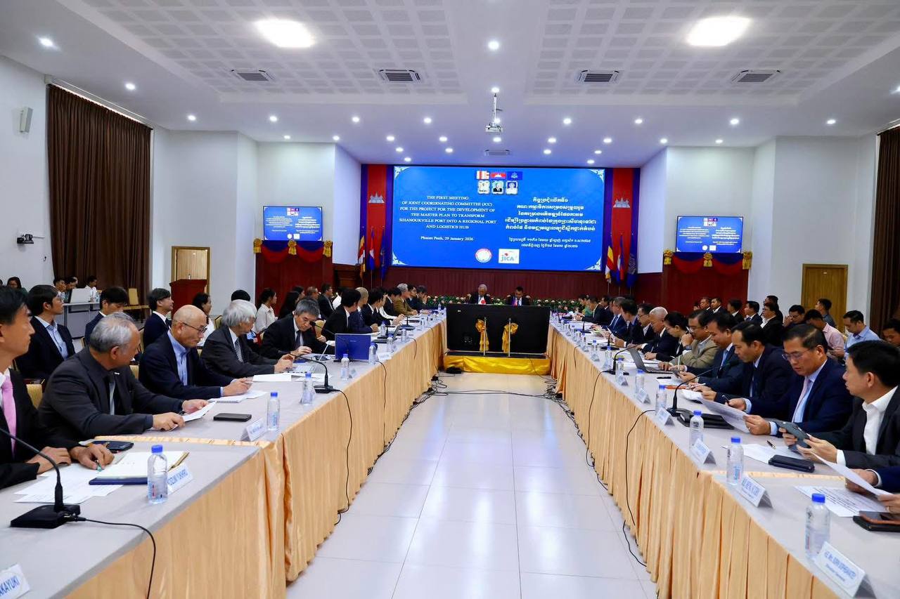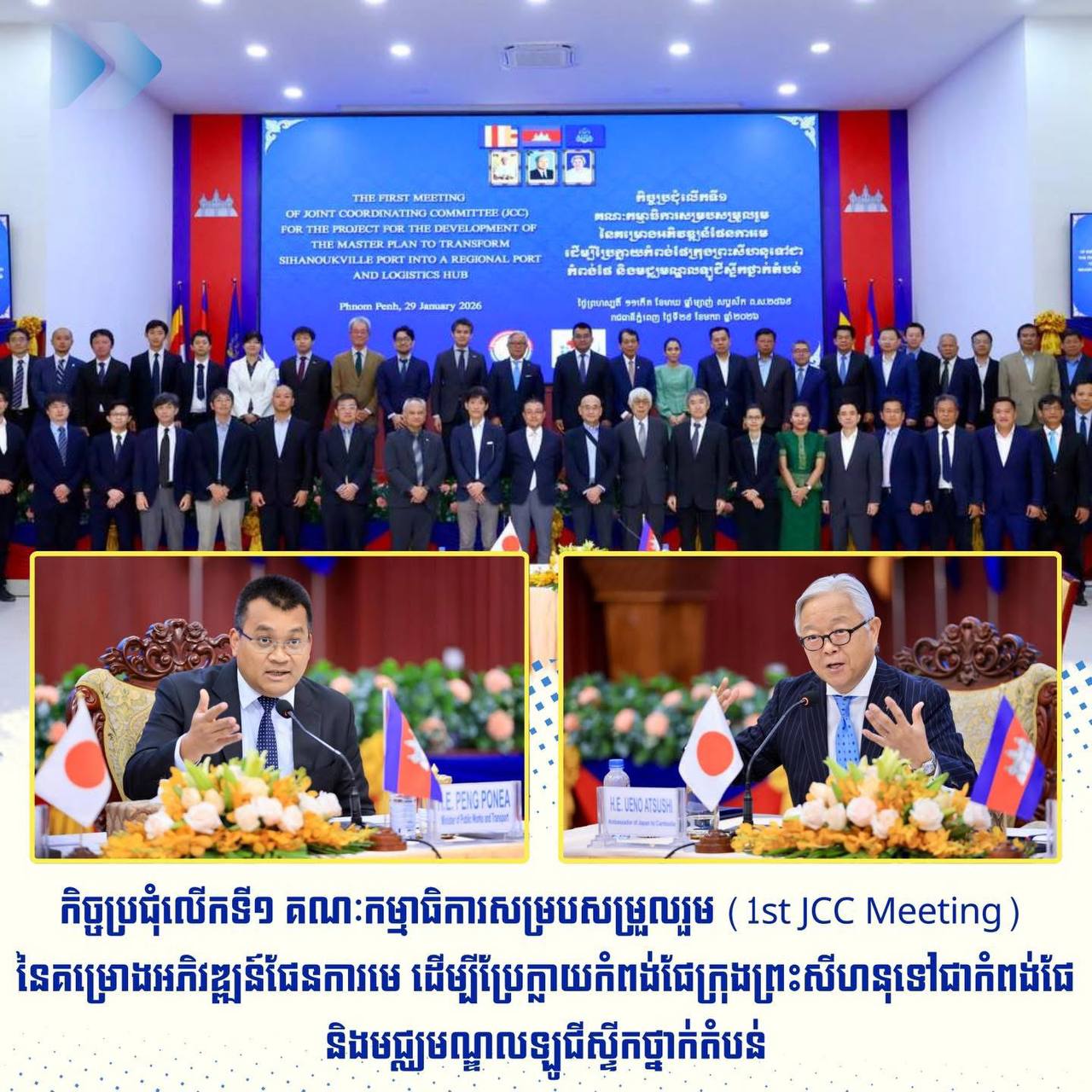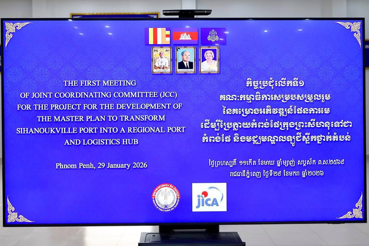 (ភ្នំពេញ )៖ លោក ប៉េង ពោធិ៍នា រដ្ឋមន្ត្រីក្រសួងសាធារណការ និងដឹកជញ្ជូន និងលោក UENO Atsushi ឯកអគ្គរាជទូតវិសាមញ្ញ និងពេញសមត្ថភាពនៃប្រទេសជប៉ុនប្រចាំកម្ពុជា នារសៀលថ្ងៃទី២៩ ខែមករា ឆ្នាំ២០២៦នេះ បានអញ្ជើញជាសហប្រធានដឹកនាំកិច្ចប្រជុំលើកទី១ គណៈកម្មាធិការសម្របសម្រួលរួម នៃគម្រោងអភិវឌ្ឍន៍ផែនការមេ ដើម្បីប្រែក្លាយកំពង់ផែក្រុងព្រះសីហនុទៅជាកំពង់ផែ និងមជ្ឈមណ្ឌលឡូជីស្ទីកថា្នក់តំបន់។