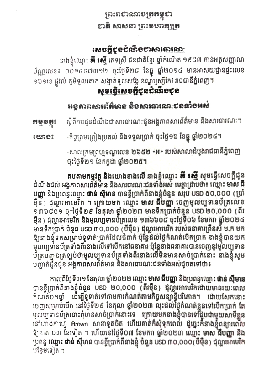 លោកស្រី គី រស្មី ចេញសេចក្តីជូនដំណឹងជាសារធារណៈករណី លោក មាស ធី បញ្ញា និងប្រពន្ធឈ្មោះ ផាន់ ស៊ីមាន ខ្ចីប្រាក់ ៥០,០០០ ដុល្លារអាមេរិក