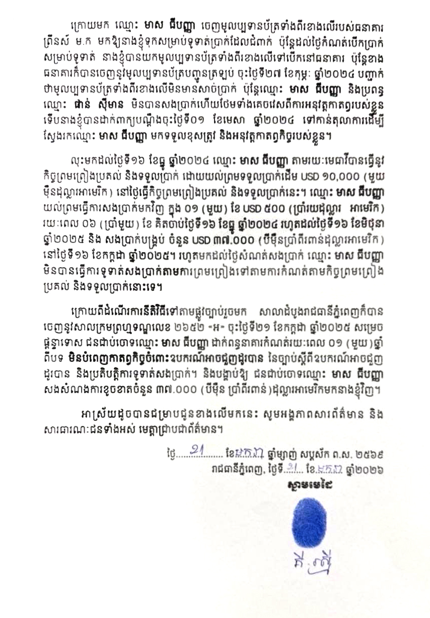 ក្នុងសេចក្តីជូនដំណឹងបានបញ្ជាក់ថា កាលពីថ្ងៃទី៣១ ខែតុលា ឆ្នាំ២០២២ ឈ្មោះ មាស ធីបញ្ញា និងប្រពន្ធឈ្មោះ ផាន់ ស៊ីមាន បានខ្ចីប្រាក់ពីលោកស្រី គី រស្មី ចំនួន USD ២០,០០០ (ពីរម៉ឺន) ដុល្លារអាមេរិកដោយមានរយៈពេល កំណត់០១ឆ្នាំ ដើម្បីទូទាត់ទៅតាមការកំណត់តាមកិច្ចសន្យាខ្ចីបរិភោគ។ ដោយសែកនោះ ចេញសម្រាប់បើកនៅថ្ងៃទី២៩ ខែតុលា ឆ្នាំ២០២៣ លុះដល់ថ្ងៃកំណត់ខ្លួនទៅបើកប្រាក់ តែមូលប្បទានប័ត្រនោះពុំមានសាច់ប្រាក់នោះទេ។ ក្រោយមក លោកស្រី គី រស្មី បានទៅជួបជាមួយសាមីខ្លួន នៅហាងកាហ្វេ Brown សាខាទូតចិន ហើយគាត់ក៏សុំទុកពេល ដូច្នេះក៏លោកស្រី គី រស្មី ពន្យារពេល ឱ្យគាត់ ០៣ខែទៀត។ នៅថ្ងៃទី០៧ ខែមករា ឆ្នាំ២០២៣ ឈ្មោះ មាស ធីបញ្ញា និង ប្រពន្ធ ឈ្មោះ ផាន់ ស៊ីមាន បានខ្ចីប្រាក់ពីលោកស្រី គី រស្មី ចំនួន USD ៣០,០០០ (បីម៉ឺន) ដុល្លារអាមេរិក បន្ថែមទៀត។