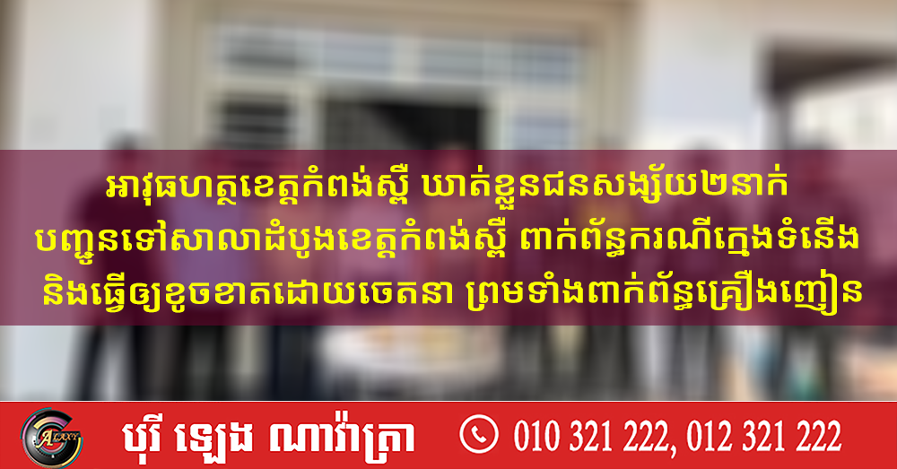 អាវុធហត្ថខេត្តកំពង់ស្ពឺ ឃាត់ខ្លួនជនសង្ស័យ២នាក់ បញ្ជូនទៅសាលាដំបូងខេត្តកំពង់ស្ពឺ ពាក់ព័ន្ធករណីក្មេងទំនើង និងធ្វើឲ្យខូចខាតដោយចេតនា ព្រមទាំងពាក់ព័ន្ធគ្រឿងញៀន