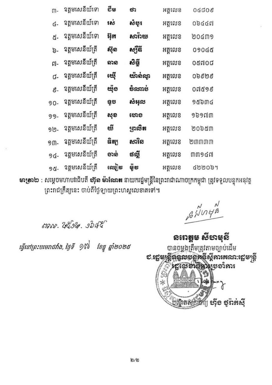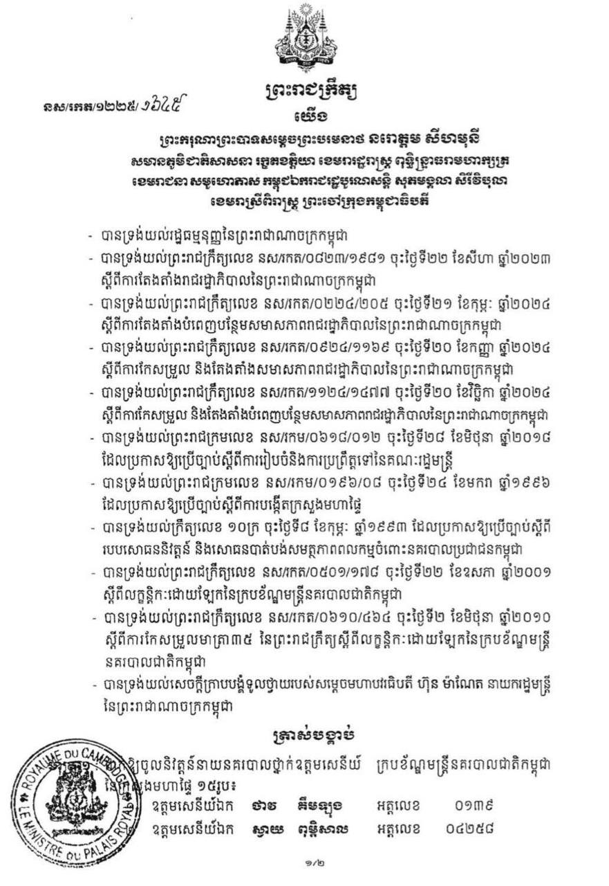 ព្រះមហាក្សត្រ ចេញព្រះរាជក្រឹត្យ ដាក់ឲ្យនាយនគរបាល ថ្នាក់ឧត្តមសេនីយ៍ ១៥រូប ចូលនិវត្តន៍