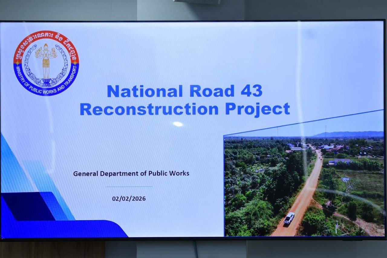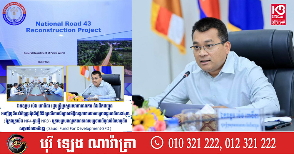 (ភ្នំពេញ)៖ លោក ប៉េង ពោធិ៍នា រដ្ឋមន្ត្រីក្រសួងសាធារណការ និងដឹកជញ្ជូន នាព្រឹកថ្ងៃទី២ ខែកុម្ភៈ ឆ្នាំ២០២៦ បានអញ្ជើញដឹកនាំកិច្ចប្រជុំដើម្បីពិនិត្យលើវឌ្ឍនភាព ការសិក្សាសមិទ្ធិលទ្ធភាពបឋមគម្រោងផ្លូវជាតិលេខ៤៣ (ត្រែងត្រយឹង NR4-ទ្វារថ្មី NR3) ក្រោមក្របខណ្ឌឥណទានសម្បទានពីមូលនិធិសាអូឌីតសម្រាប់ការអភិវឌ្ឍ (Saudi Fund For Development-SFD) ដោយមានការចូលរួមពីថ្នាក់ដឹកនាំក្រសួង និងមន្រ្តីពាក់ព័ន្ធ៕