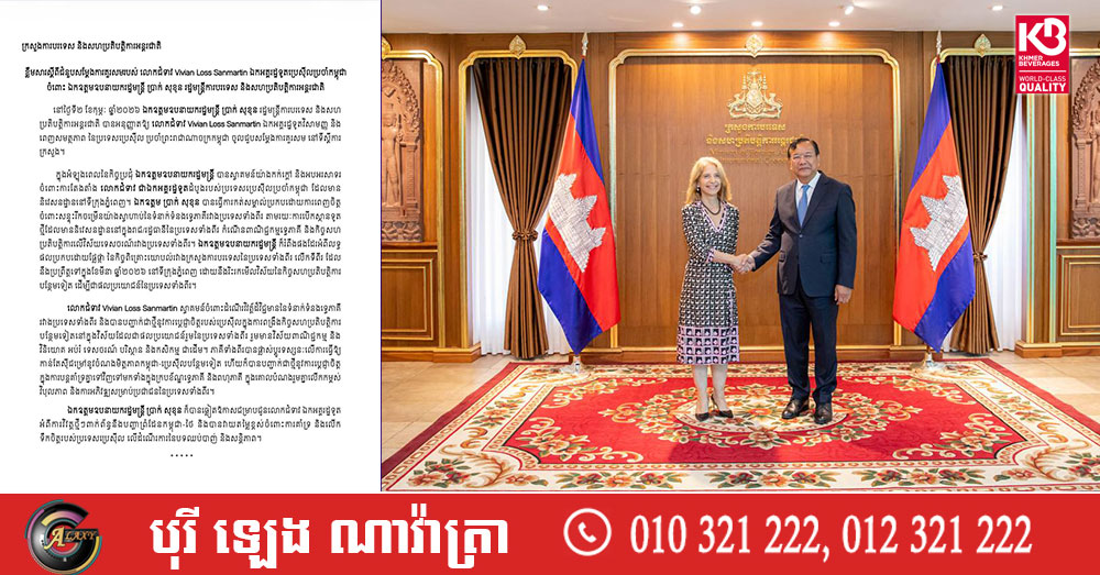 (ភ្នំពេញ)៖ លោកឧបនាយករដ្ឋមន្ត្រី ប្រាក់ សុខុន រដ្ឋមន្ត្រីការបរទេស និងសហ ប្រតិបត្តិការអន្តរជាតិ នៅថ្ងៃទី២ ខែកុម្ភៈ ឆ្នាំ២០២៦ បានអនុញ្ញាតឱ្យលោកស្រី Vivian Loss Sanmartin ឯកអគ្គរដ្ឋទូតវិសាមញ្ញ និងពេញសមត្ថភាព នៃប្រទេសប្រេស៊ីល ប្រចាំព្រះរាជាណាចក្រកម្ពុជា ចូលជួបសម្តែងការគួរសម និងពិភាក្សាការងារ ហើយភាគីទាំងពីរបានបេ្ដជ្ញារឹតចំណងមិត្តភាពកាន់តែស៊ីជម្រៅលើគ្រប់វិស័យ។