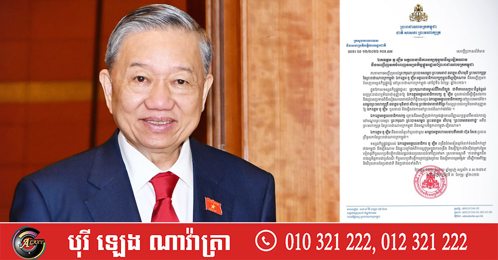 (ភ្នំពេញ)៖ តបតាមការអញ្ជើញរបស់ព្រះករុណា ព្រះបាទសម្តេច ព្រះបរមនាថ នរោត្តម សីហមុនី ព្រះមហាក្សត្រ នៃព្រះរាជាណាចក្រកម្ពុជា លោក តូ ឡឹម អគ្គលេខាធិការបក្សកុម្មុយនីស្តវៀតណាម នឹងអញ្ជើញមកបំពេញទស្សនកិច្ចផ្លូវរដ្ឋ នៅព្រះរាជាណាចក្រកម្ពុជា នៅថ្ងៃទី៦ ខែកុម្ភៈ ឆ្នាំ២០២៦។