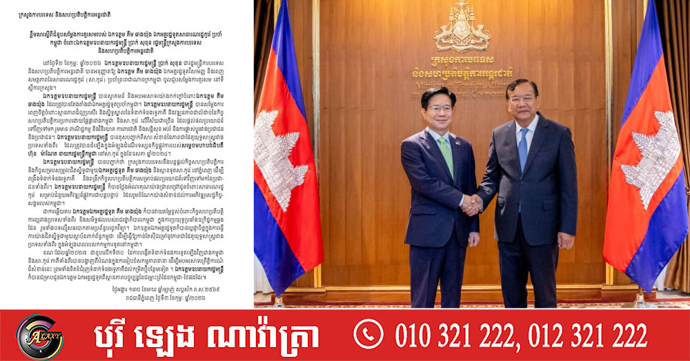 (ភ្នំពេញ)៖ នៅទីស្តីការក្រសួង លោកឧបនាយករដ្ឋមន្ត្រី ប្រាក់ សុខុន ជារដ្ឋមន្ត្រីការបរទេស និងសហប្រតិបត្តិការអន្តរជាតិ និងលោក គឹម ឆាងយ៉ុង ឯកអគ្គរដ្ឋទូតវិសាមញ្ញ និងពេញសមត្ថភាពនៃសាធារណរដ្ឋកូរ៉េ (សា.កូរ៉េ) ប្រចាំព្រះរាជាណាចក្រកម្ពុជា នៅថ្ងៃទី២ ខែកុម្ភៈ ឆ្នាំ២០២៦ បានប្ដេជ្ញាពង្រឹងទំនាក់ទំនងទ្វេភាគី និងពង្រីកកិច្ចសហប្រតិបត្តិការ សម្រាប់ផលប្រយោជន៍ទៅវិញទៅមក របស់ប្រជាជនទាំងពីរ។