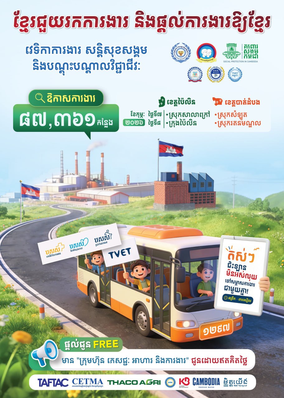 (ភ្នំពេញ)៖ ក្រសួងការងារ និងបណ្ដុះបណ្ដាលវិជ្ជាជីវៈតាមរយៈវេទិកាការងារ សន្តិសុខសង្គម និងបណ្តុះបណ្តាលវិជ្ជាជីវៈ គ្រោងនាំយកឱកាសការងារចំនួន ៨៧ ៣៦១កន្លែងសម្រាប់បងប្អូនអតីតពលករខ្មែរដែលទើបត្រឡប់មកពីប្រទេសថៃ និងប្រជាពលរដ្ឋខេត្តបាត់ដំបង និងប៉ៃលិន នៅថ្ងៃទី០៧-០៨ ខែកុម្ភៈខាងមុខនេះ។