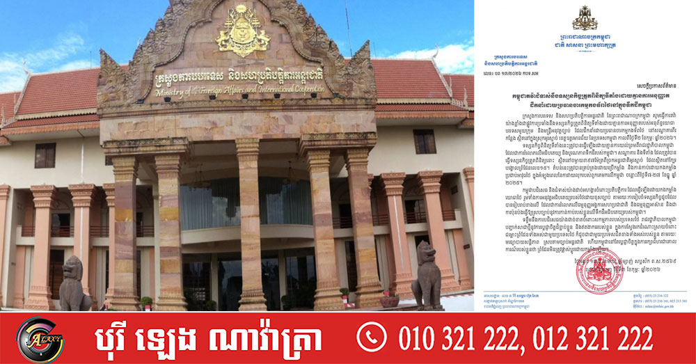 (ភ្នំពេញ)៖ ក្រសួងការបរទេស និងសហប្រតិបត្តិការអន្តរជាតិ នៃព្រះរាជាណាចក្រកម្ពុជា នៅថ្ងៃទី៤ ខែកុម្ភៈ ឆ្នាំ២០២៦ បានចេញលិខិតធ្វើការតវ៉ា យ៉ាងខ្លាំងជាផ្លូវការប្រឆាំងនឹងទស្សនកិច្ចត្រួតពិនិត្យទីតាំង ដោយគ្មានការអនុញ្ញាតរបស់អនុព័ន្ធយោធា បរទេសមួយក្រុម និងមន្ត្រីអនុវត្តច្បាប់ ដែលដឹកនាំដោយប្រធានចារកម្មកងទ័ពថៃ នៅសណ្ឋាគារពីរកន្លែង ស្ថិតនៅក្នុងច្រកទ្វារអូរស្មាច់ ខេត្តឧត្តរមានជ័យ នៃប្រទេសកម្ពុជា កាលពីថ្ងៃទី២ ខែកុម្ភៈ ឆ្នាំ២០២៦។