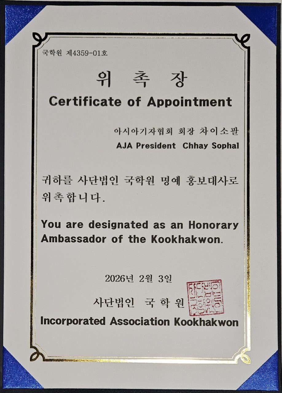 សូមបញ្ជាក់ដែរថា ឯកឧត្តមបណ្ឌិត ឆាយ សុផល ក៏ជាប្រធានសមាគមអ្នកសារព័ត៌មានអាស៊ី (Asian Journalist Association) មានមូលដ្ឋាននៅរដ្ឋធានីសេអ៊ូលផងដែរ ដែលមានសមាជិកជាអ្នកសារព័ត៌មានមកពីជិត៣០ប្រទេស នៅក្នុងទ្វីបអាស៊ី និងមជ្ឈឹមបូព៌ា។